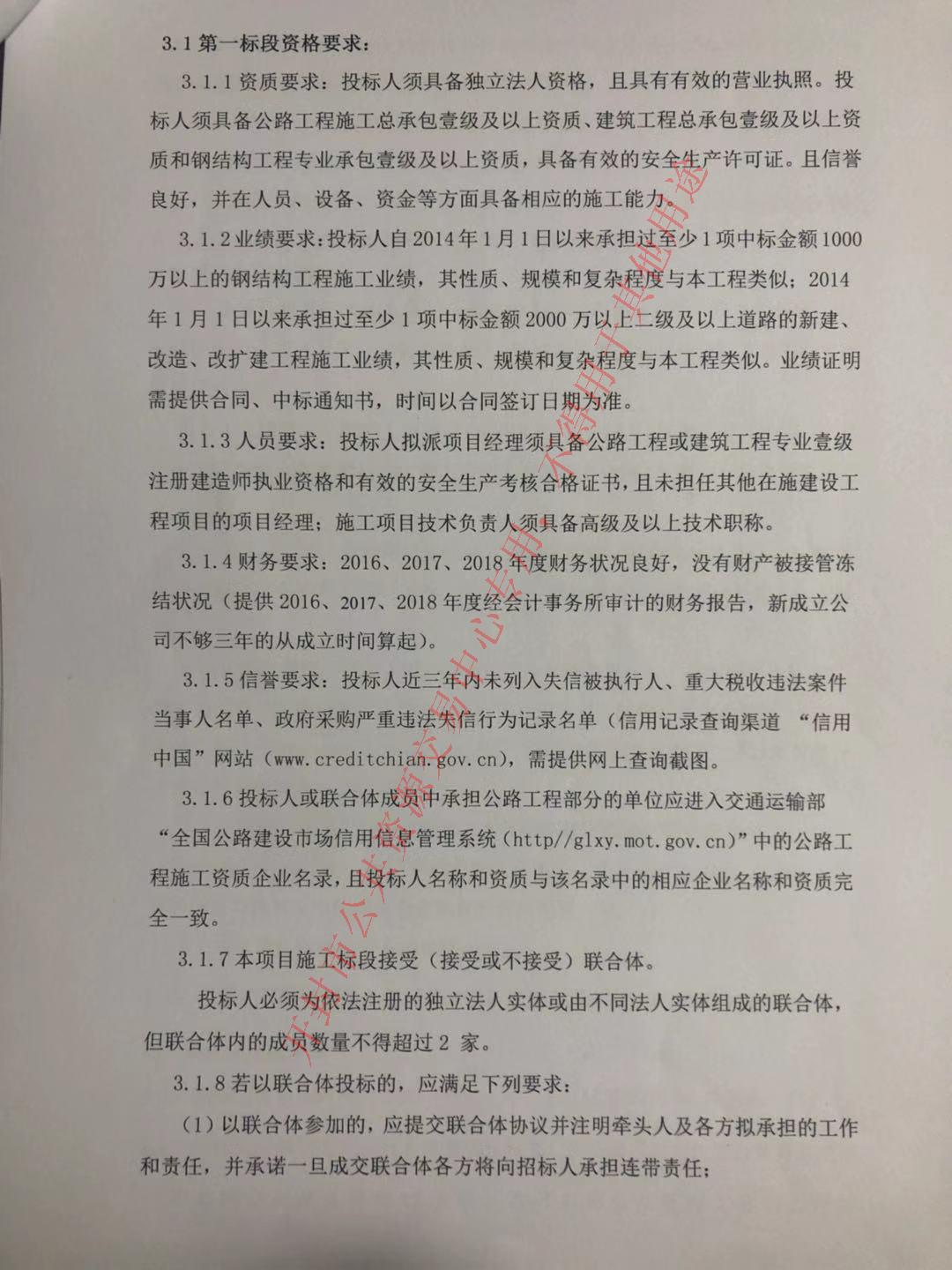 3.1.2业绩要求:投标人自2014年1月1日以来承担过至少1项中标金额1000万以上的钢结构工程施工业绩,其性质、规模和复杂程度与本工程类似;2014年1月1日以来承担过至少1项中标金额2000万以上二级及以上道路的新建、改造、改扩建工程施工业绩,其性质、规模和复杂程度与本工程类似。业绩证明需提供合同、中标通知书,时间以合同签订日期为准。