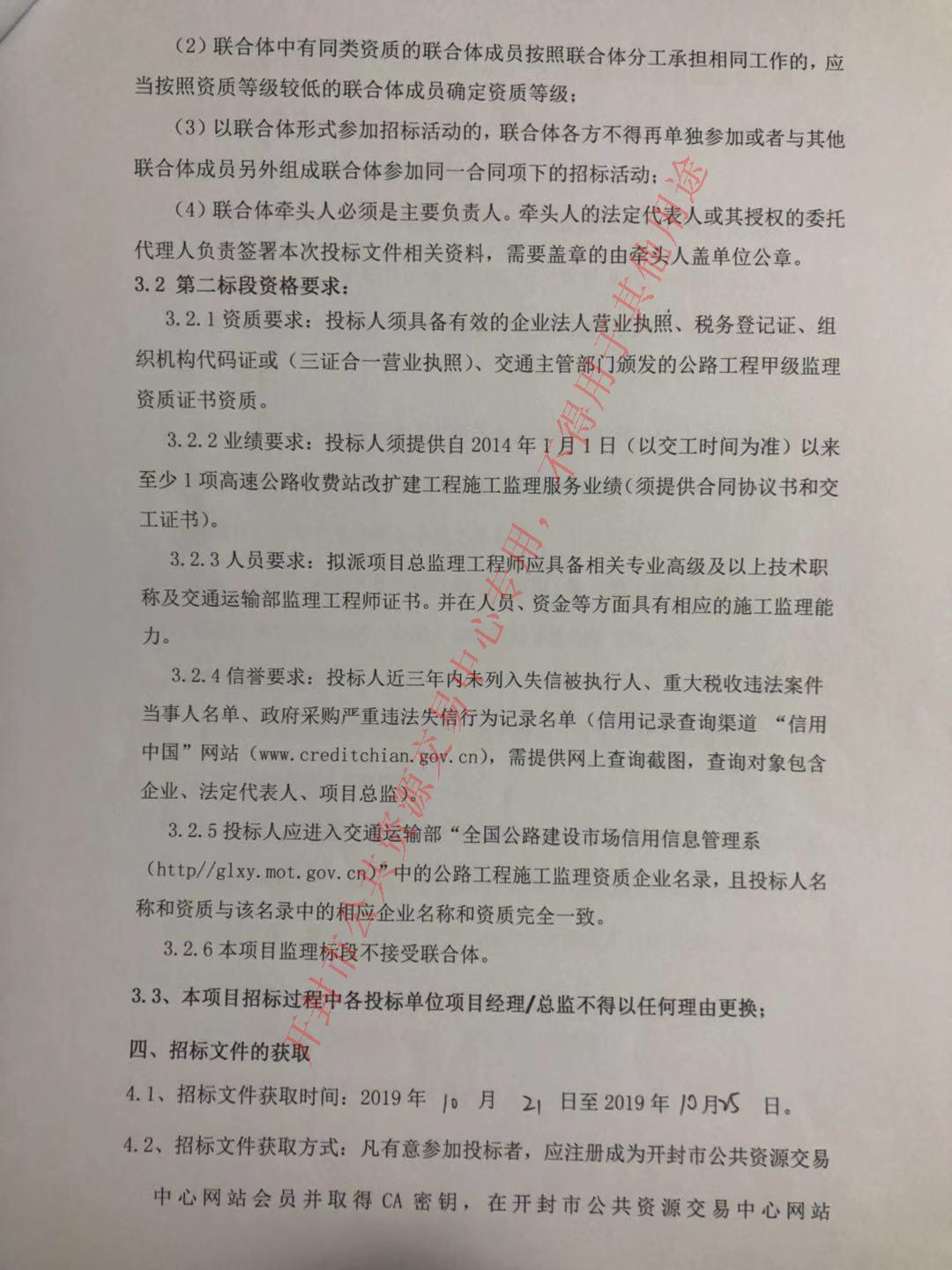 3.2.5投标人应进入交通运输部“全国公路建设市场信用信息管理系(http//glxy.mot.gov.cn)”中的公路工程施工监理资质企业名录,且投标人名称和资质与该名录中的相应企业名称和资质完全一致。