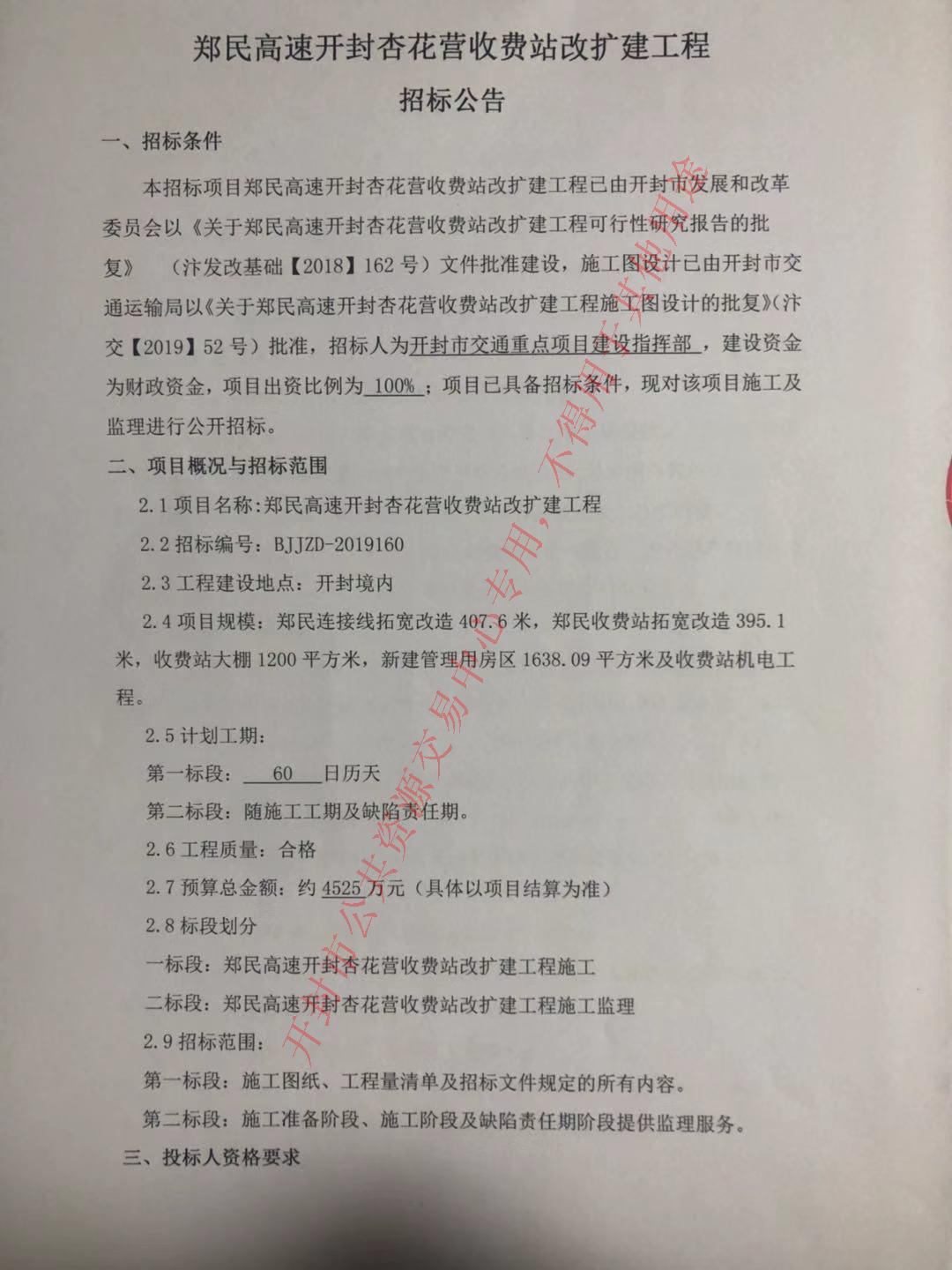 本招标项目郑民高速开封杏花营收费站改扩建工程已由开封市发展和改革委员会以《关于郑民高速开封杏花营收费站改扩建工程可行性研究报告的批复》 (汴发改基础【2018】162号)文件批准建设,施工图设计已由开封市交通运输局以《关于郑民高速开封杏花营收费站改扩建工程施工图设计的批复》(汴交【2019】52号)批准,招标人为开封市交通重点项目建设指挥部 ,建设资金为财政资金,项目出资比例为 100% ;项目已具备招标条件,现对该项目施工及监理进行公开招标。