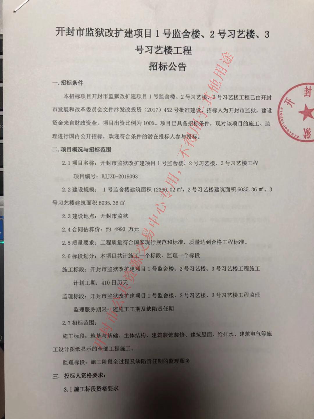施工标段:开封市监狱改扩建项目1号监舍楼、2号习艺楼、3号习艺楼工程施工