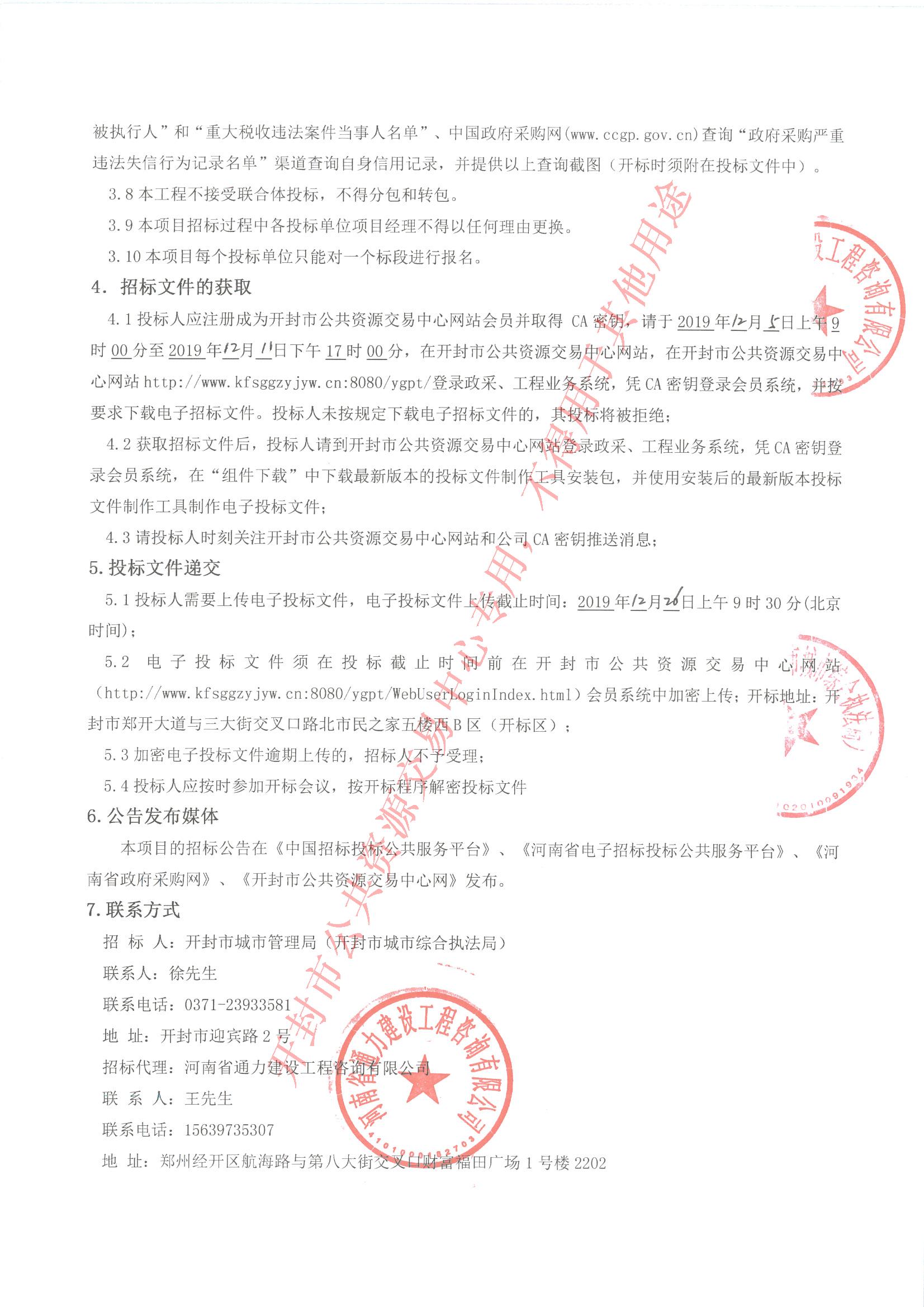 4.1投标人应注册成为开封市公共资源交易中心网站会员并取得 CA密钥,请于2019年 12 月 5 日上午9时00分至2019年 12 月 11 日下午17时00分,在开封市公共资源交易中心网站,在开封市公共资源交易中心网站http://www.kfsggzyjyw.cn:8080/ygpt/登录政采、工程业务系统,凭CA密钥登录会员系统,并按要求下载电子招标文件。投标人未按规定下载电子招标文件的,其投标将被拒绝;