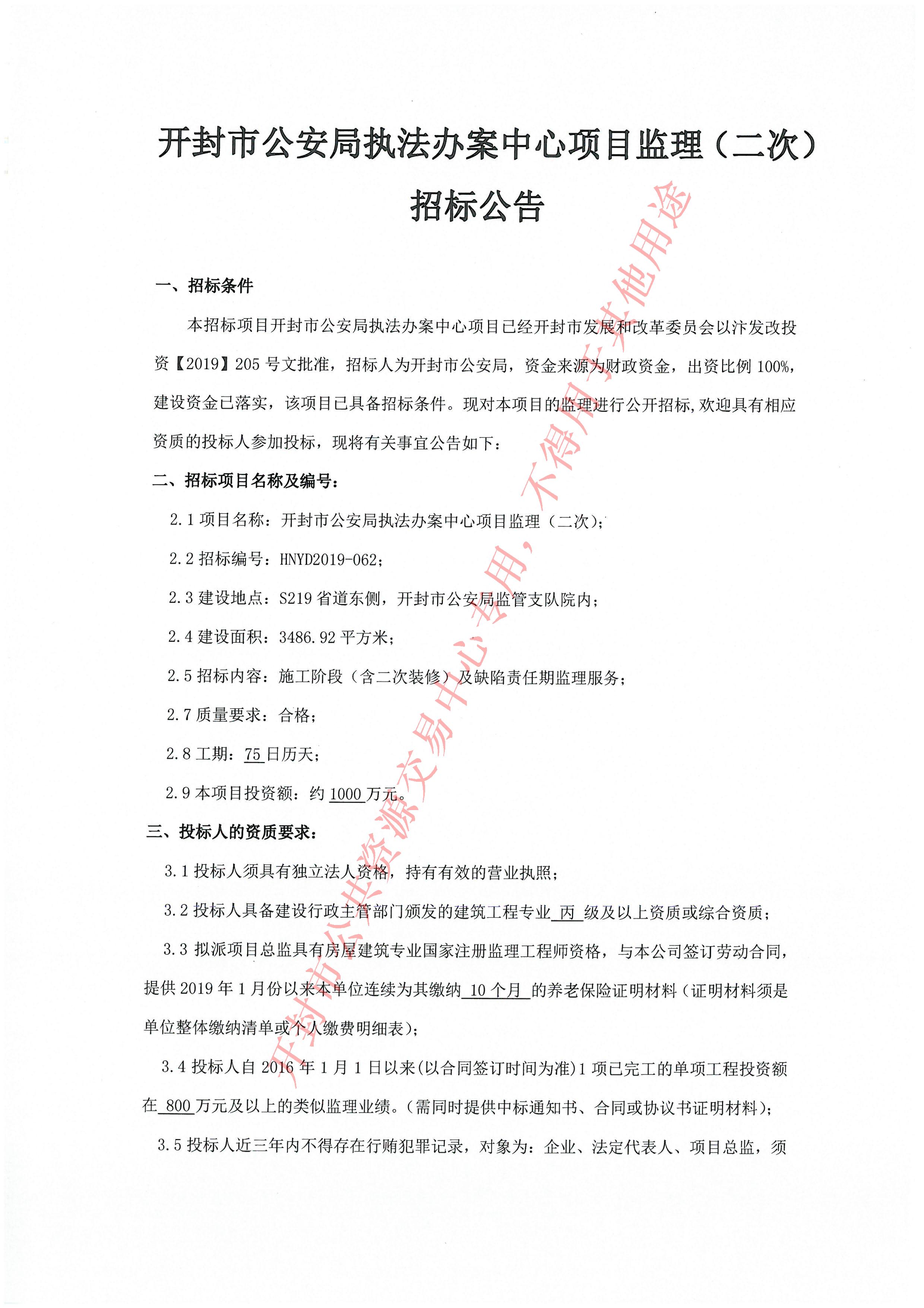 本招标项目开封市公安局执法办案中心项目已经开封市发展和改革委员会以汴发改投资【2019】205号文批准,招标人为开封市公安局,资金来源为财政资金,出资比例100%,建设资金已落实,该项目已具备招标条件。现对本项目的监理进行公开招标,欢迎具有相应资质的投标人参加投标,现将有关事宜公告如下: