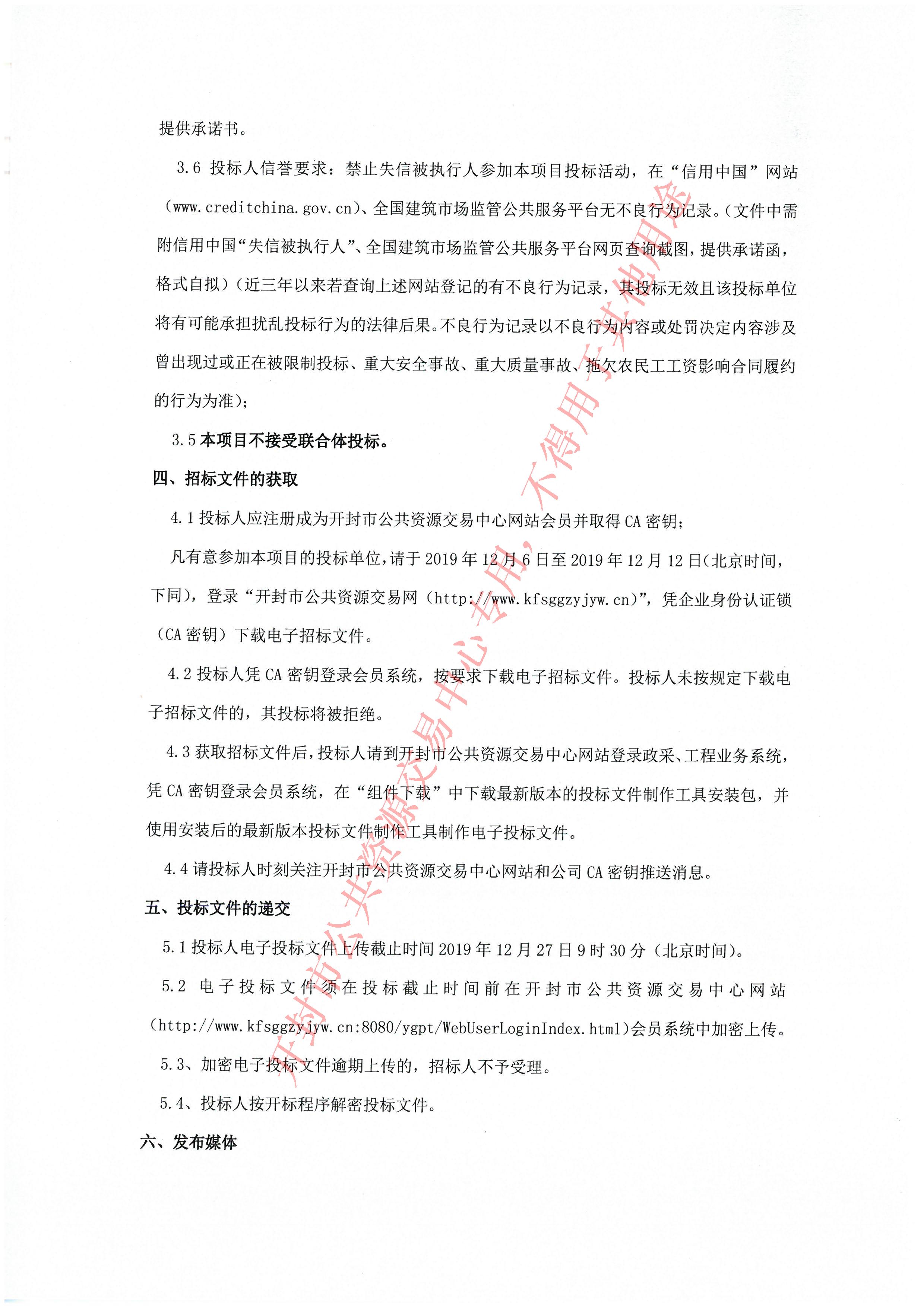 凡有意参加本项目的投标单位,请于2019年12月6日至2019年12月12日(北京时间,下同),登录“开封市公共资源交易网(http://www.kfsggzyjyw.cn)”,凭企业身份认证锁(CA密钥)下载电子招标文件。