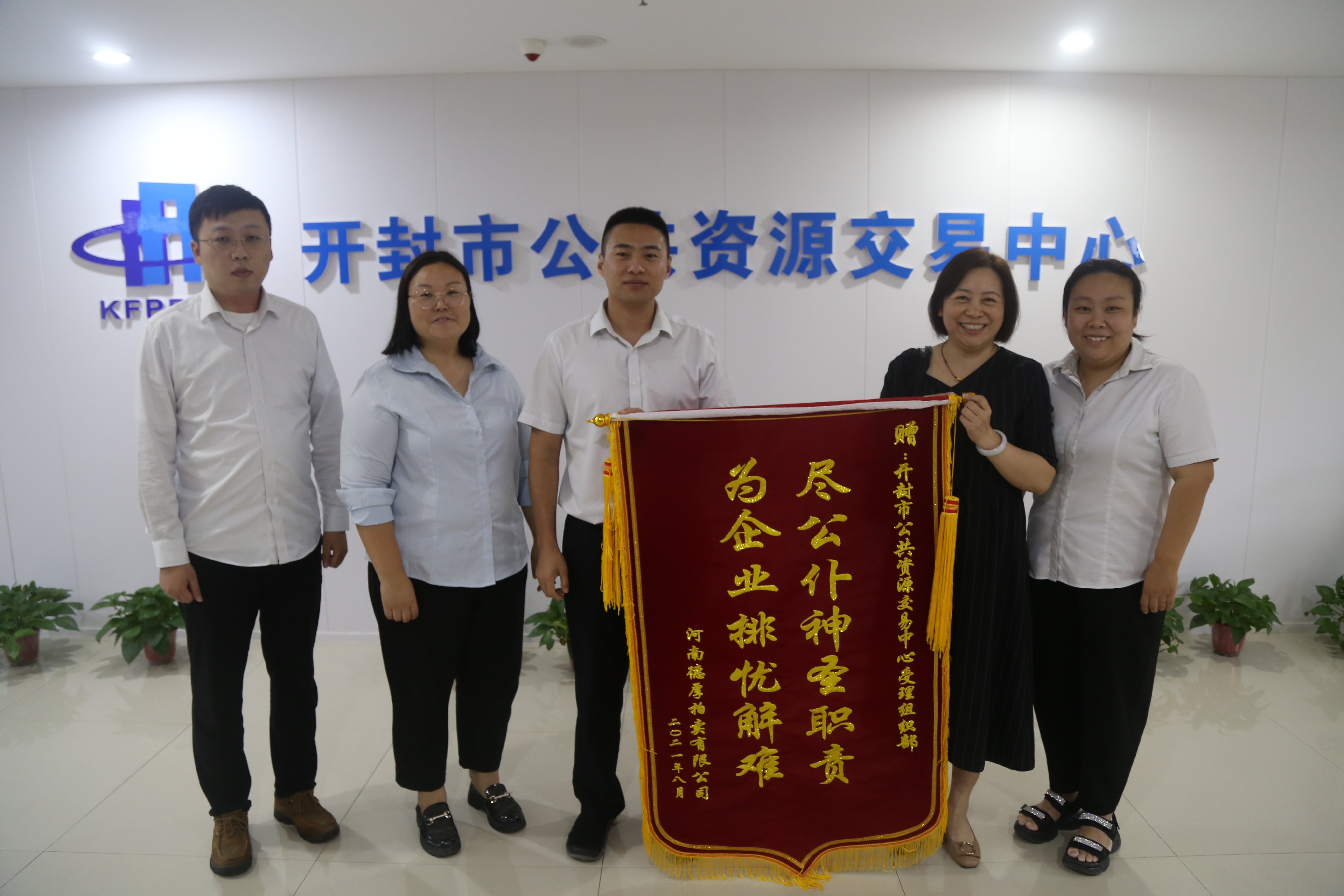 2021年9月13日上午,河南德厚拍卖有限公司负责人将一面印有“尽公仆神圣职责,为企业排忧解难”的锦旗送到开封市公共资源交易中心。
