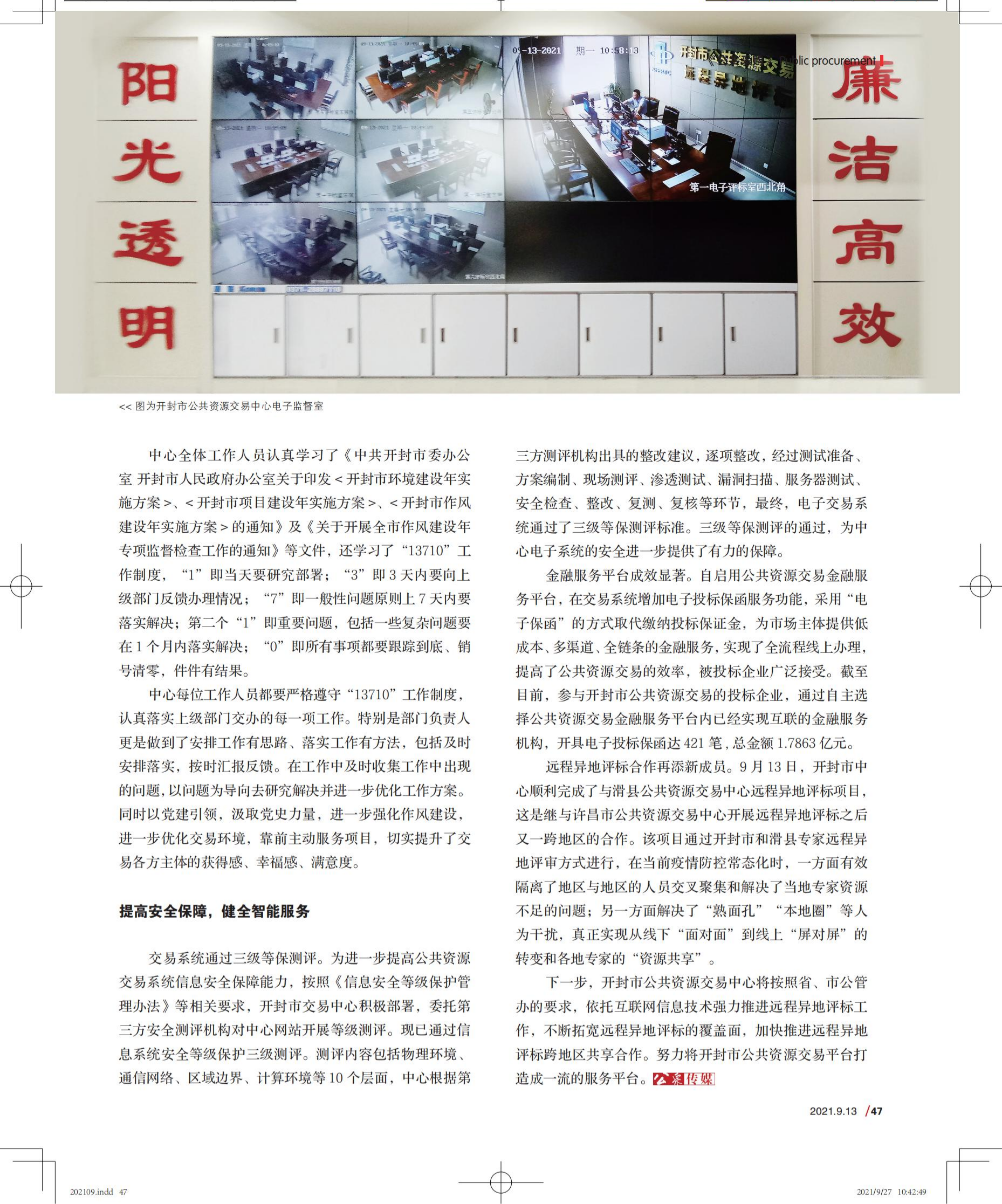 市公共资源交易中心认真贯彻落实省、市公管办各项决策部署,积极转变作风,主动超前谋划;优化营商环境,情系办事企业;提高安全保障,健全智能服务并取得优异成绩。近日,被《公共采购》杂志2021年第9期推出专栏进行宣传报道。