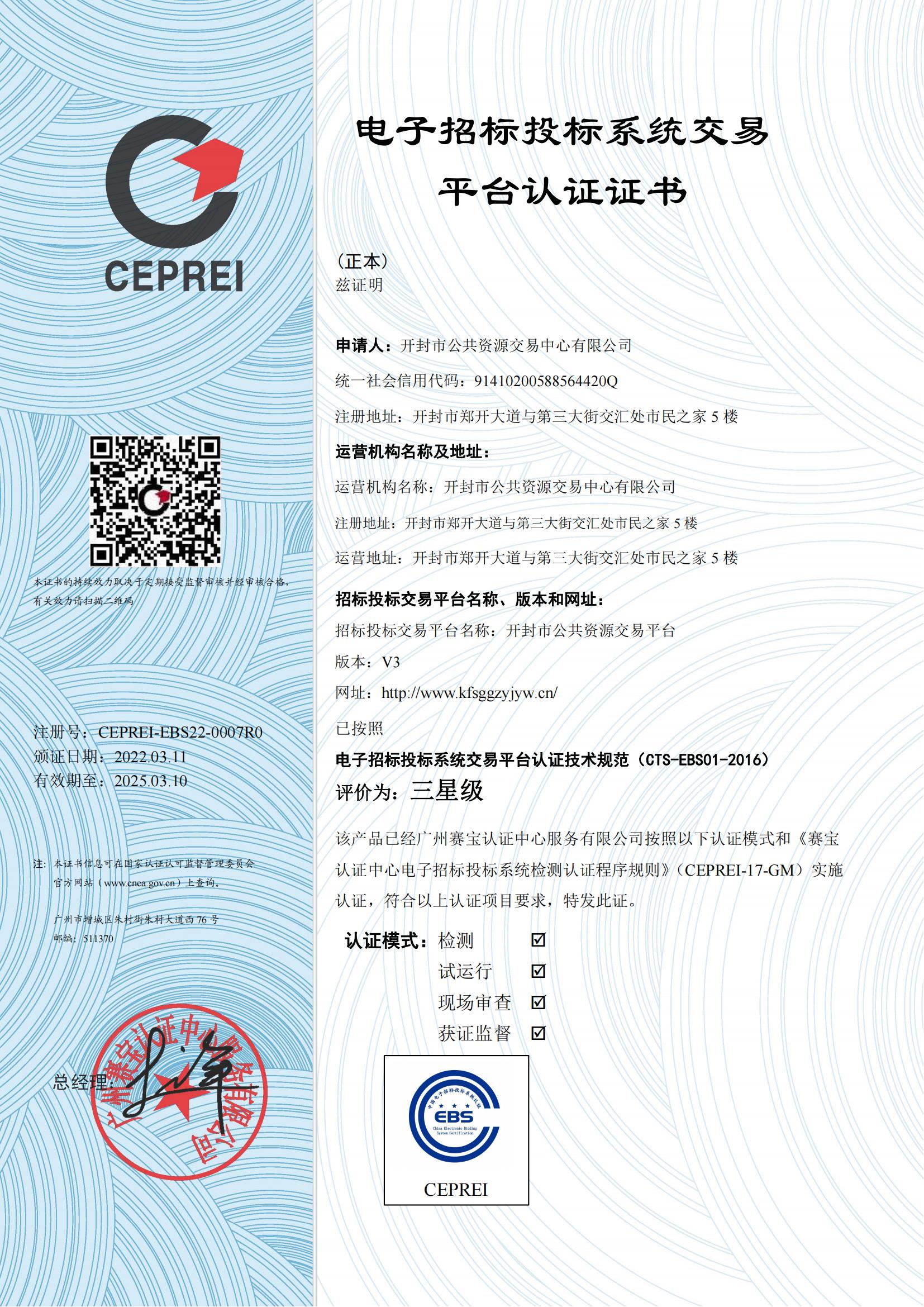 开封市公共资源交易平台正式通过广州赛宝认证中心检测认证,并获得国家电子招标投标系统(EBS)“三星”认证证书,标志着开封市公共资源交易平台在系统架构、交易功能、风险防控等方面达到全国一流水平。
