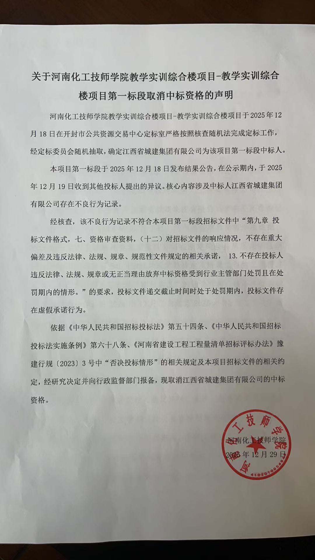 依据《中华人民共和国招标投标法》第五十四条、《中华人民共和国招标投标法实施条例》第六十八条、《河南省建设工程工程量清单招标评标办法》豫建行规〔2023〕3号中“否决投标情形”的相关规定及本项目招标文件的相关约定,经研究决定并向行政监督部门报备,现取消江西省城建集团有限公司的中标资格。
