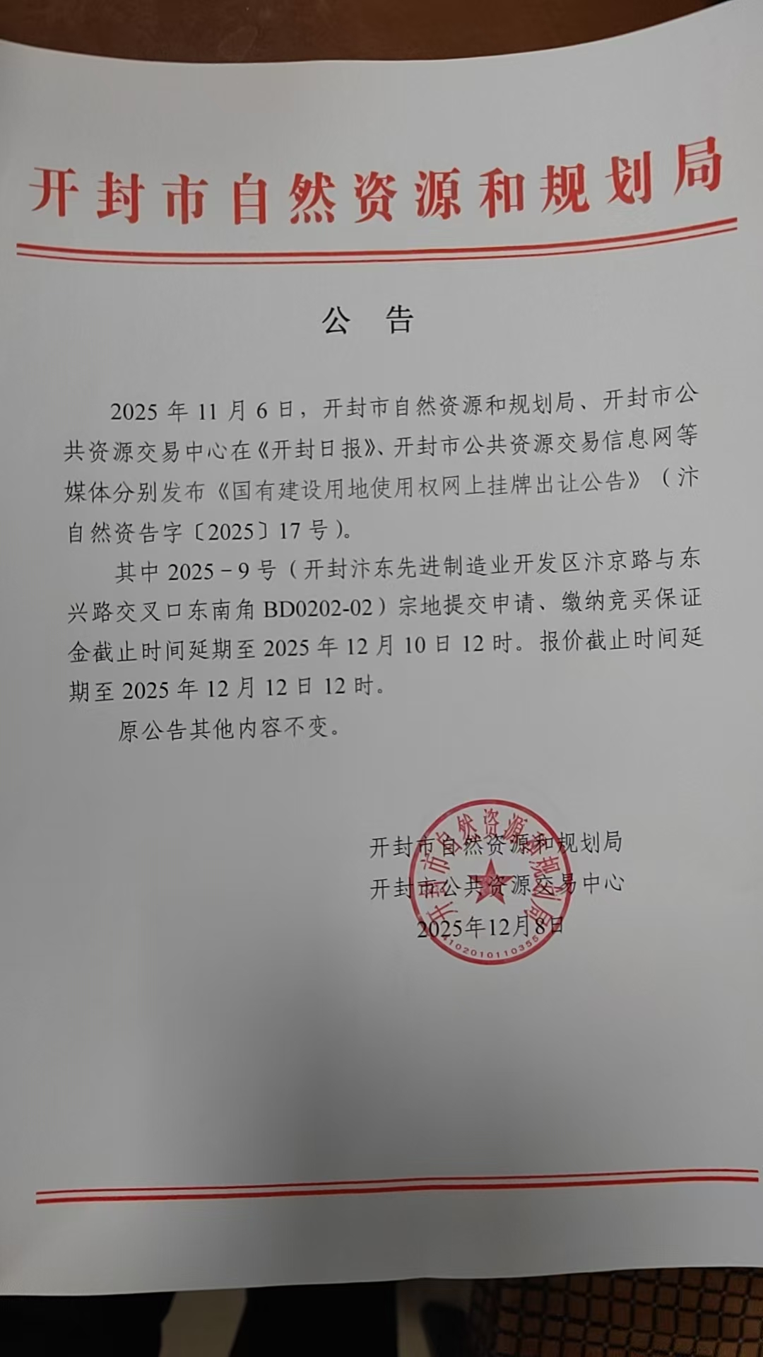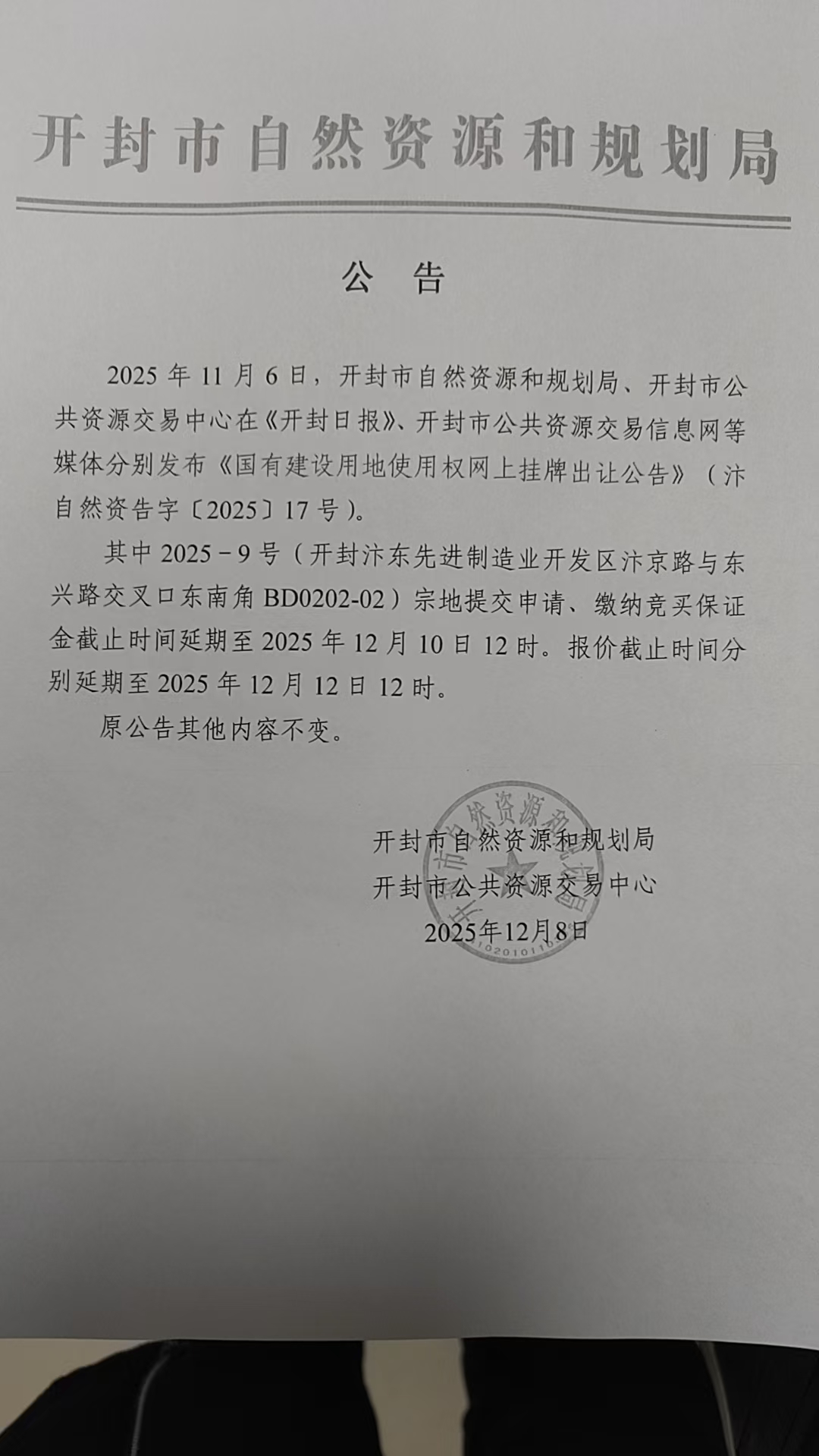 其中2025-9号(开封汴东先进制造业开发区汴京路与东兴路交叉口东南角BD0202-02)宗地提交申请、缴纳竞买保证金截止时间延期至2025年12月10日12时。报价截止时间分别延期至2025年12月12日12时。