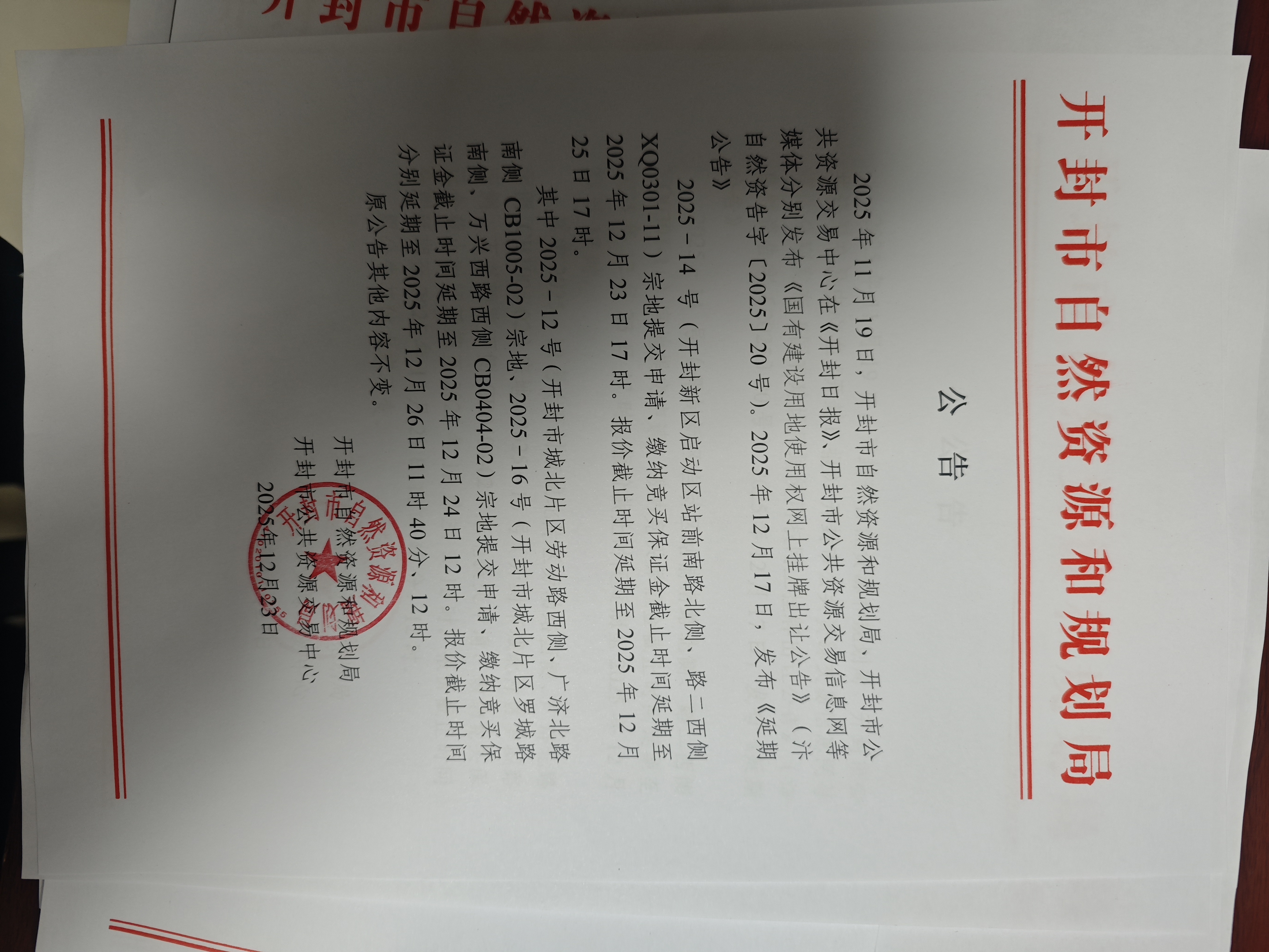 2025年11月19日,开封市自然资源和规划局、开封市公共资源交易中心在《开封日报》、开封市公共资源交易信息网等媒体分别发布《国有建设用地使用权网上挂牌出让公告》(汴自然资告字〔2025〕20号)。2025年12月17日,发布《延期公告》