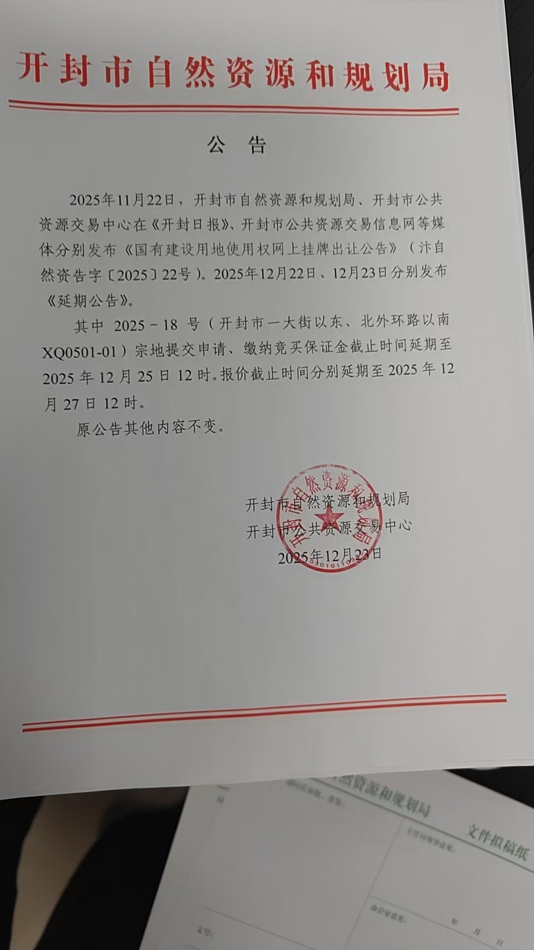 2025年11月22日,开封市自然资源和规划局、开封市公共资源交易中心在《开封日报》、开封市公共资源交易信息网等媒体分别发布《国有建设用地使用权网上挂牌出让公告》(汴自然资告字〔2025〕22号)。2025年12月22日、12月23日分别发布《延期公告》。
