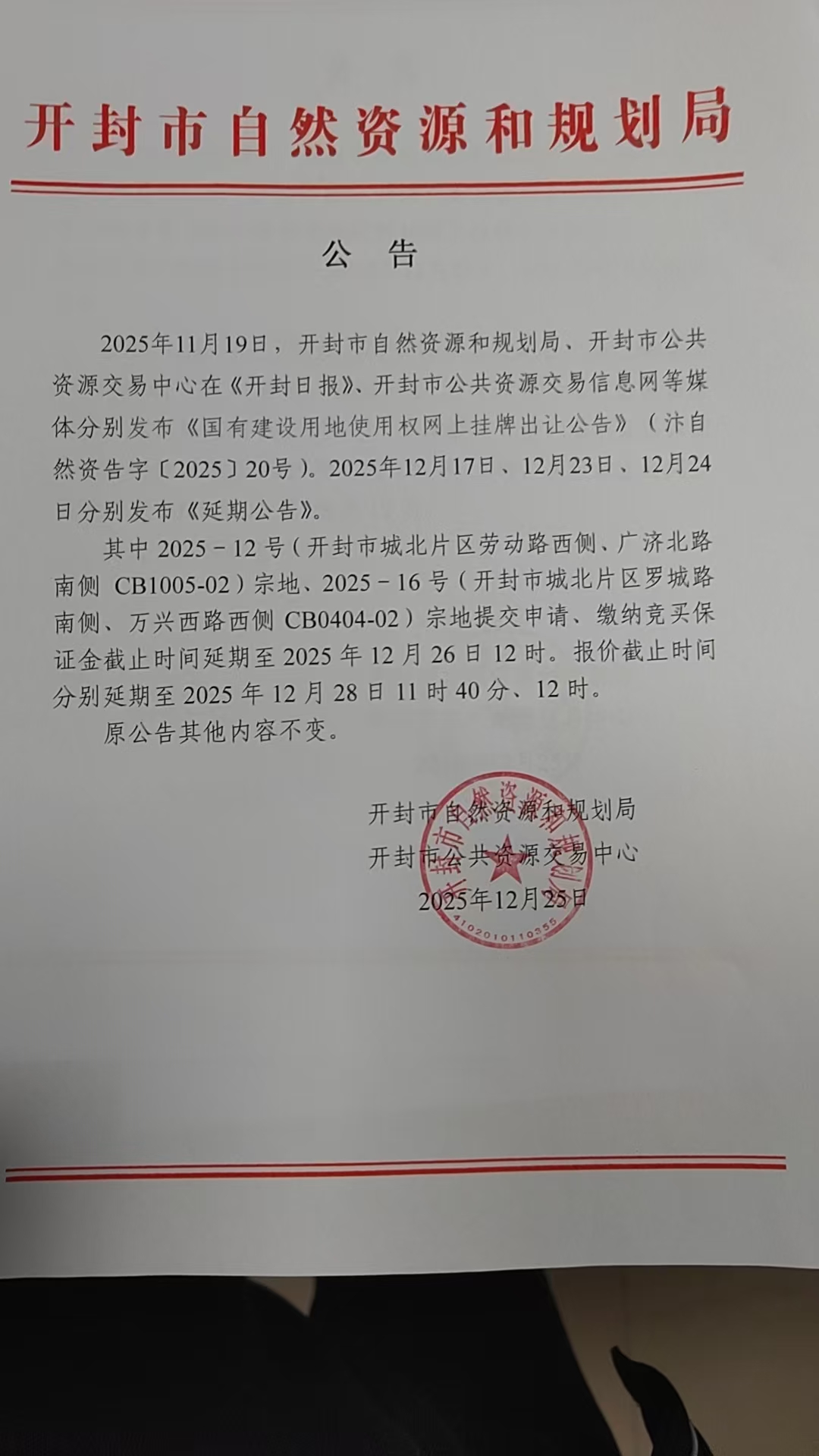 20251119日,开封市自然资源和规划局、开封市公共资源交易中心在《开封日报》、开封市公共资源交易信息网等媒体分别发布《国有建设用地使用权网上挂牌出让公告》(汴自然资告字〔202520号)。20251217日、1223日、1224日分别发布《延期公告》。