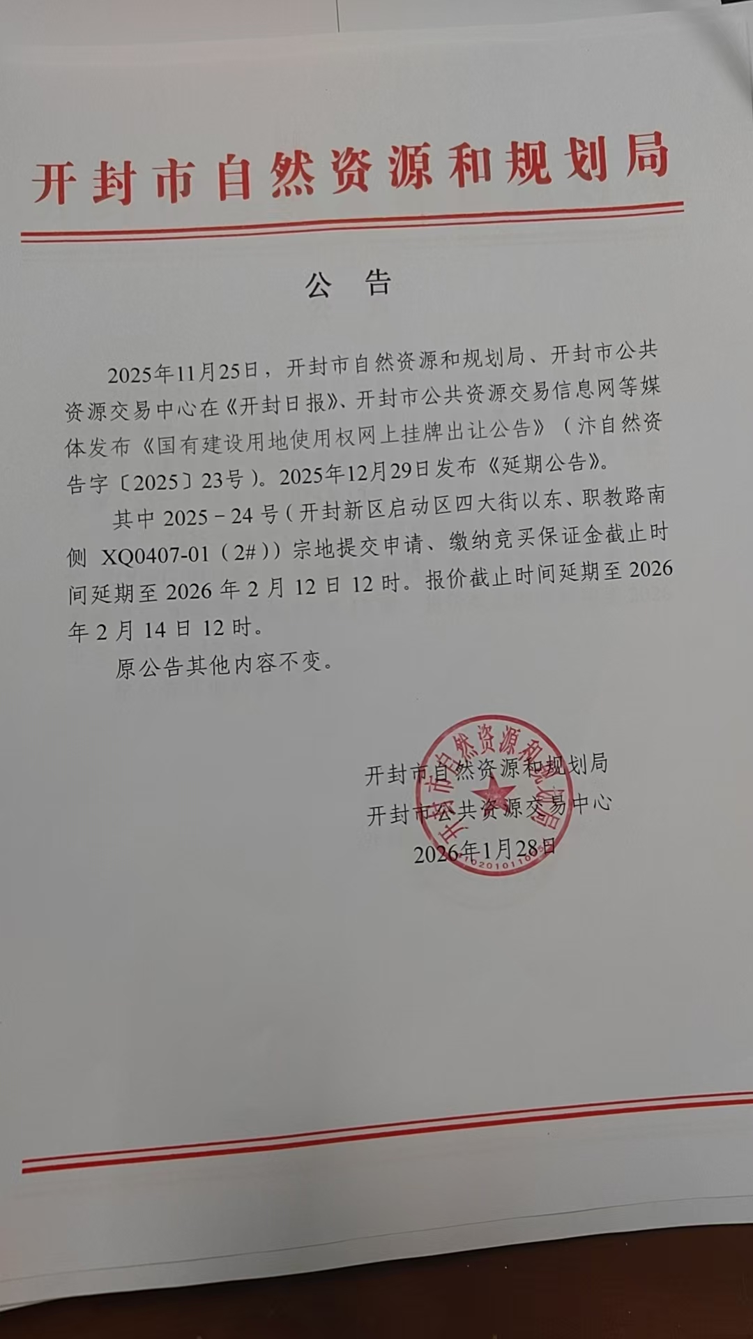 其中2025-24号(开封新区启动区四大街以东、职教路南侧XQ0407-01(2#))宗地提交申请、缴纳竞买保证金截止时间延期至2026年2月12日12时。报价截止时间延期至2026年2月14日12时。