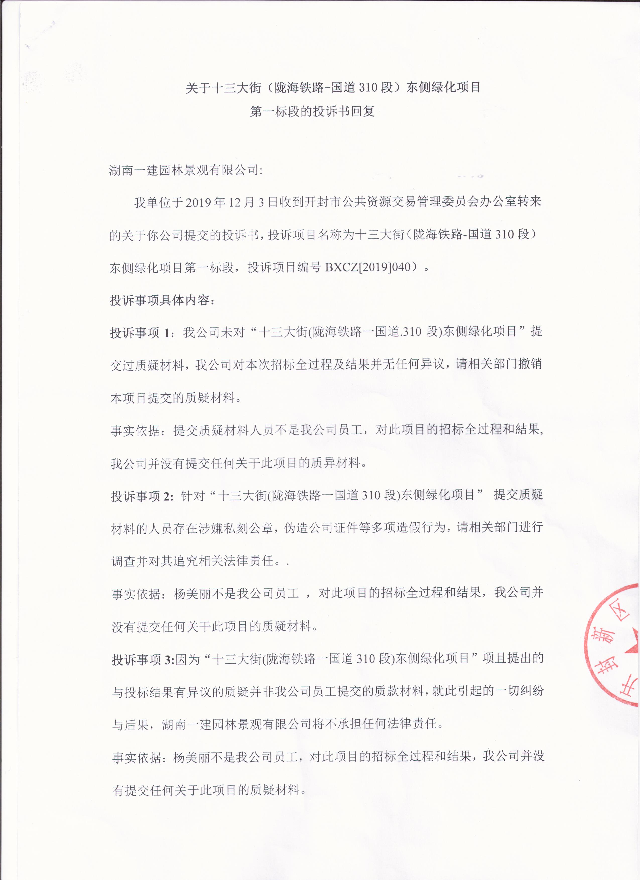 十三大街(陇海铁路-国道310段)东侧绿化项目第一标段投诉处理结果公示