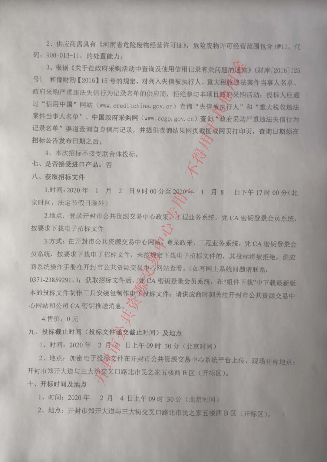 2、供应商需具有《河南省危险废物经营许可证》,危险废物许可经营范围包含HW11,代码:900-013-11,的处置能力;