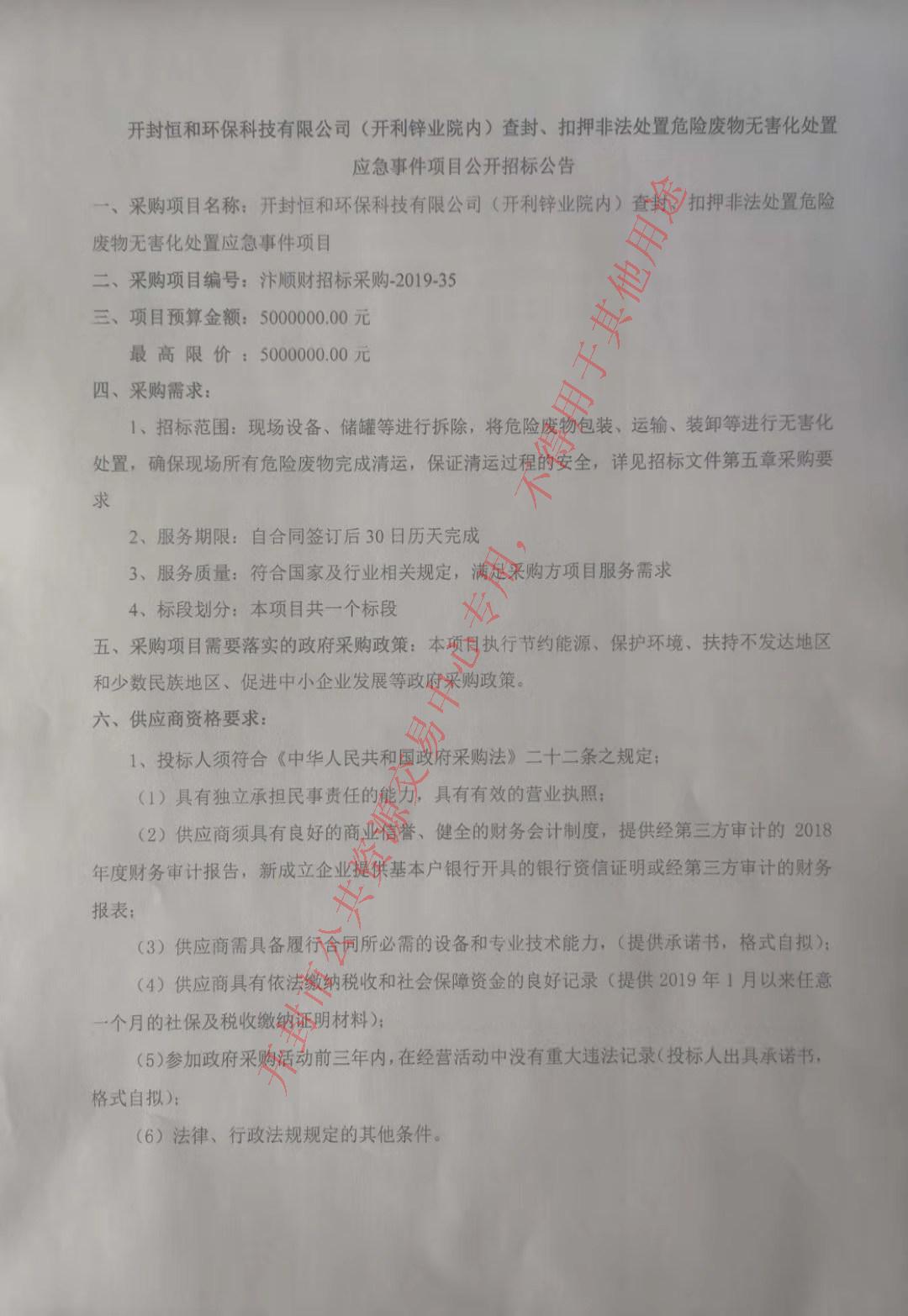 开封恒和环保科技有限公司(开利锌业院内)查封、扣押非法处置危险废物无害化处置应急事件项目公开招标公告