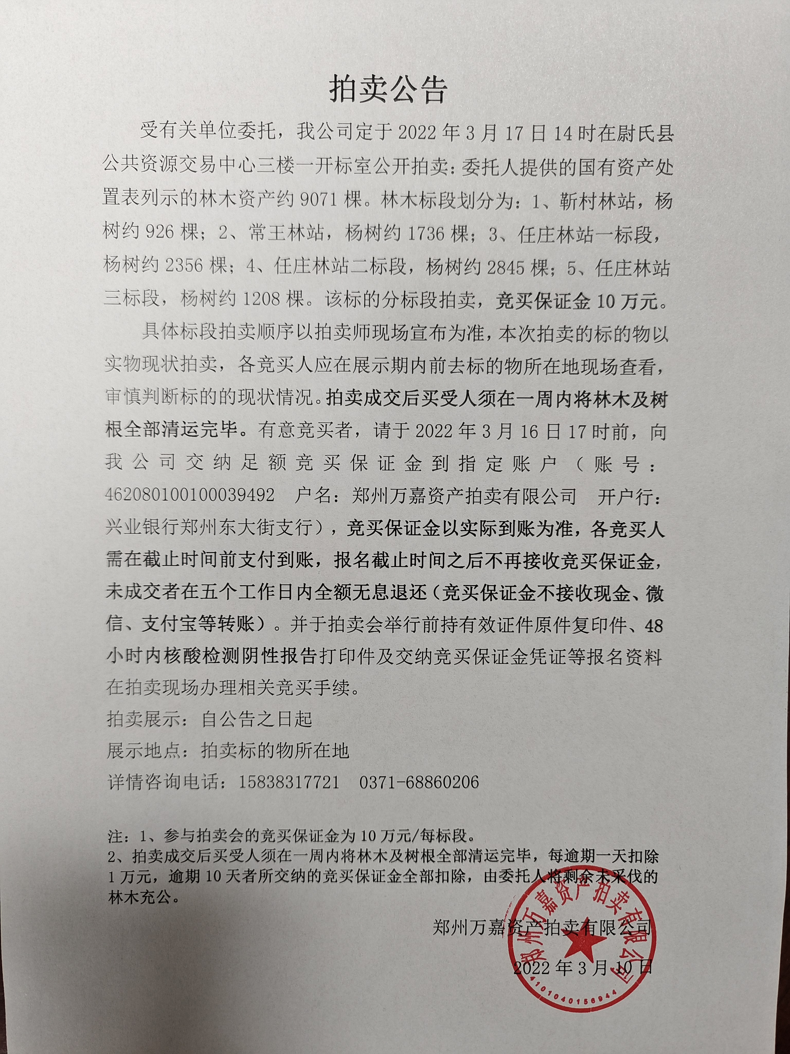 受有关单位委托,我公司定于2022年3月17日14时在尉氏县公共资源交易中心三楼一开标室公开拍卖:委托人提供的国有资产处置表列示的林木资产约9071棵。林木标段划分为:1、靳村林站,杨树约926棵;2、常王林站,杨树约1736棵;3、任庄林站一标段,杨树约2356棵;4、任庄林站二标段,杨树约2845棵;5、任庄林站三标段,杨树约1208棵。该标的分标段拍卖,竞买保证金10万元。