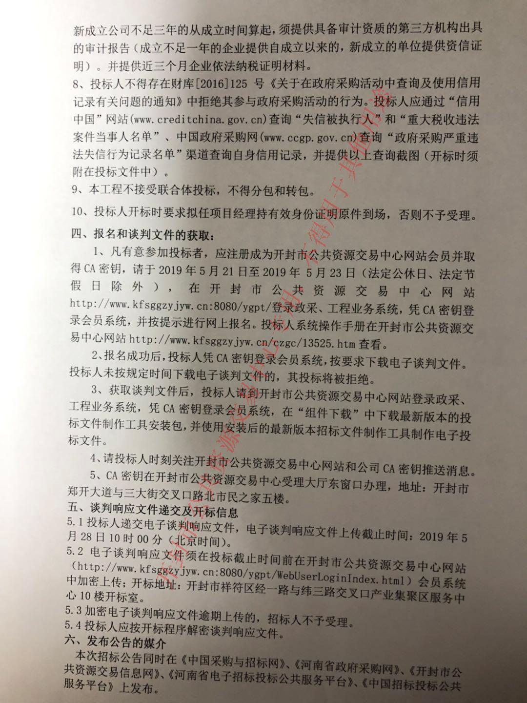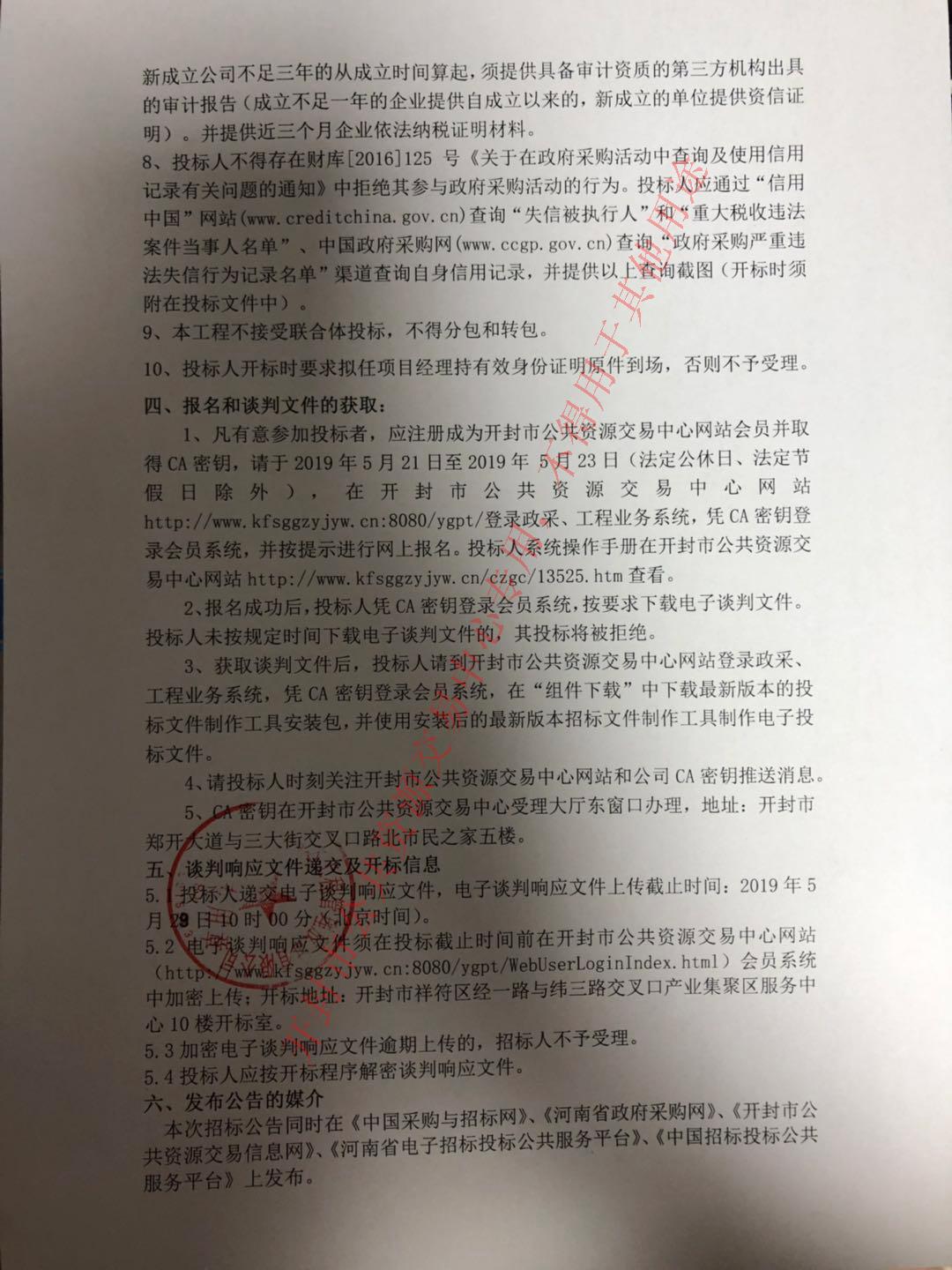 5.2电子谈判响应文件须在投标截止时间前在开封市公共资源交易中心网站(http://www.kfsggzyjyw.cn:8080/ygpt/WebUserLoginIndex.html)会员系统中加密上传;开标地址:开封市祥符区经一路与纬三路交叉口产业集聚区服务中心10楼开标室。