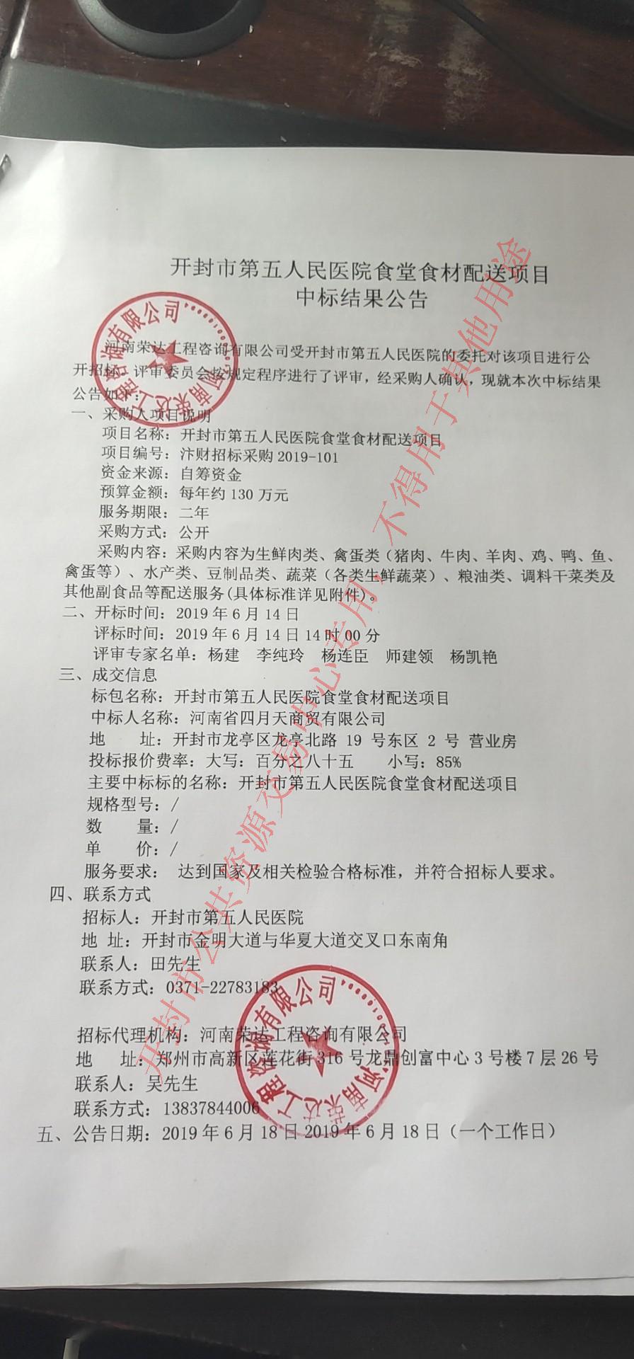 主要中标标的名称:开封市第五人民医院食堂食材配送项目