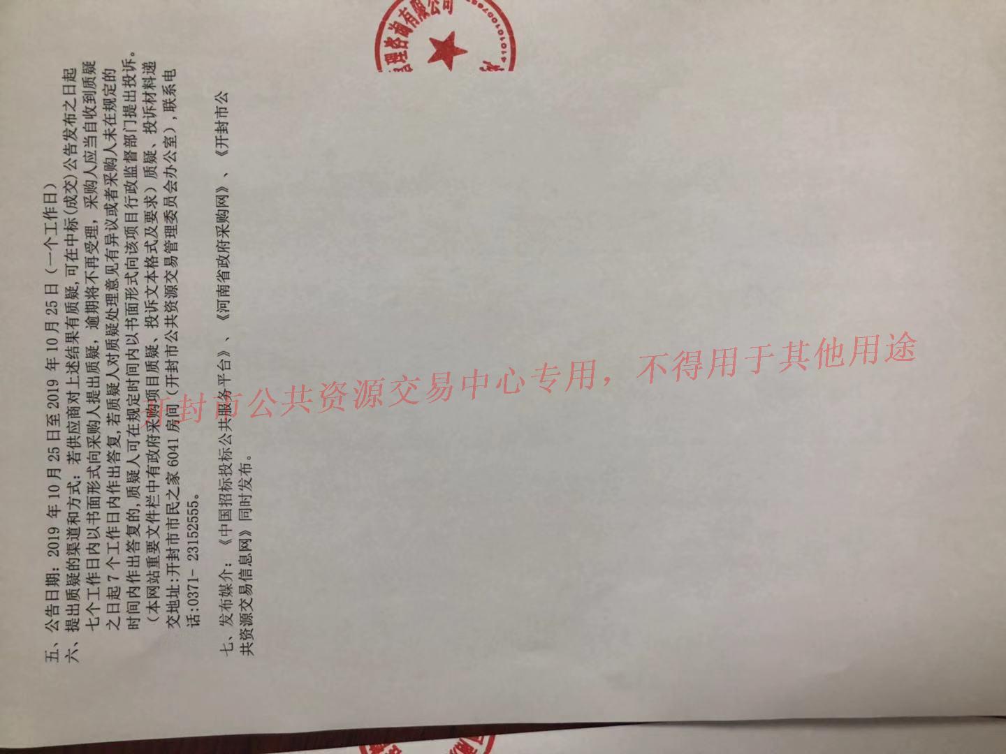 六、提出质疑的渠道和方式:若供应商对上述结果有质疑,可在中标(成交)公告发布之日起七个工作日内以书面形式向采购人提出质疑,逾期将不再受理,采购人应当自收到质疑之日起7个工作日内作出答复,若质疑人对质疑处理意见有异议或者采购人未在规定的时间内作出答复的,质疑人可在规定时间内以书面形式向该项目行政监督部门提出投诉。(本网站重要文件栏中有政府采购项目质疑、投诉文本格式及要求)质疑、投诉材料递交地址:开封市市民之家6041房间(开封市公共资源交易管理委员会办公室),联系电话:0371- 23152555。