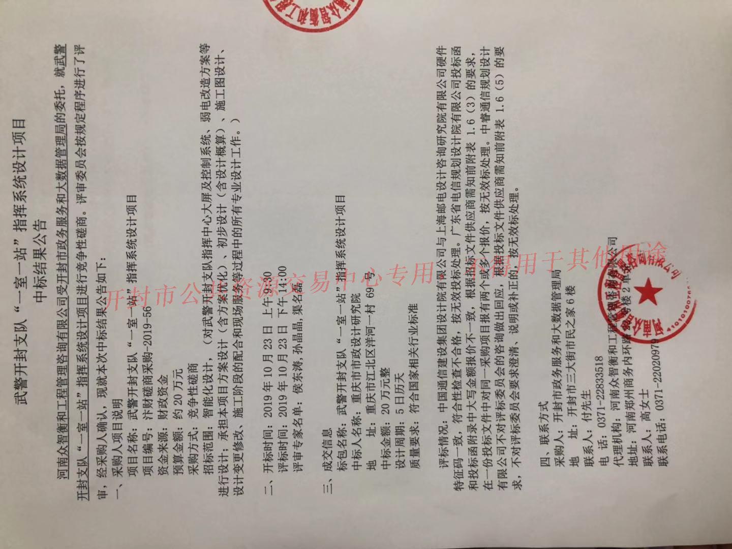 河南众智衡和工程管理咨询有限公司受开封市政务服务和大数据管理局的委托,就武警开封支队“一室一站”指挥系统设计项目进行竞争性磋商。评审委员会按规定程序进行了评审,经采购人确认,现就本次中标结果公告如下: