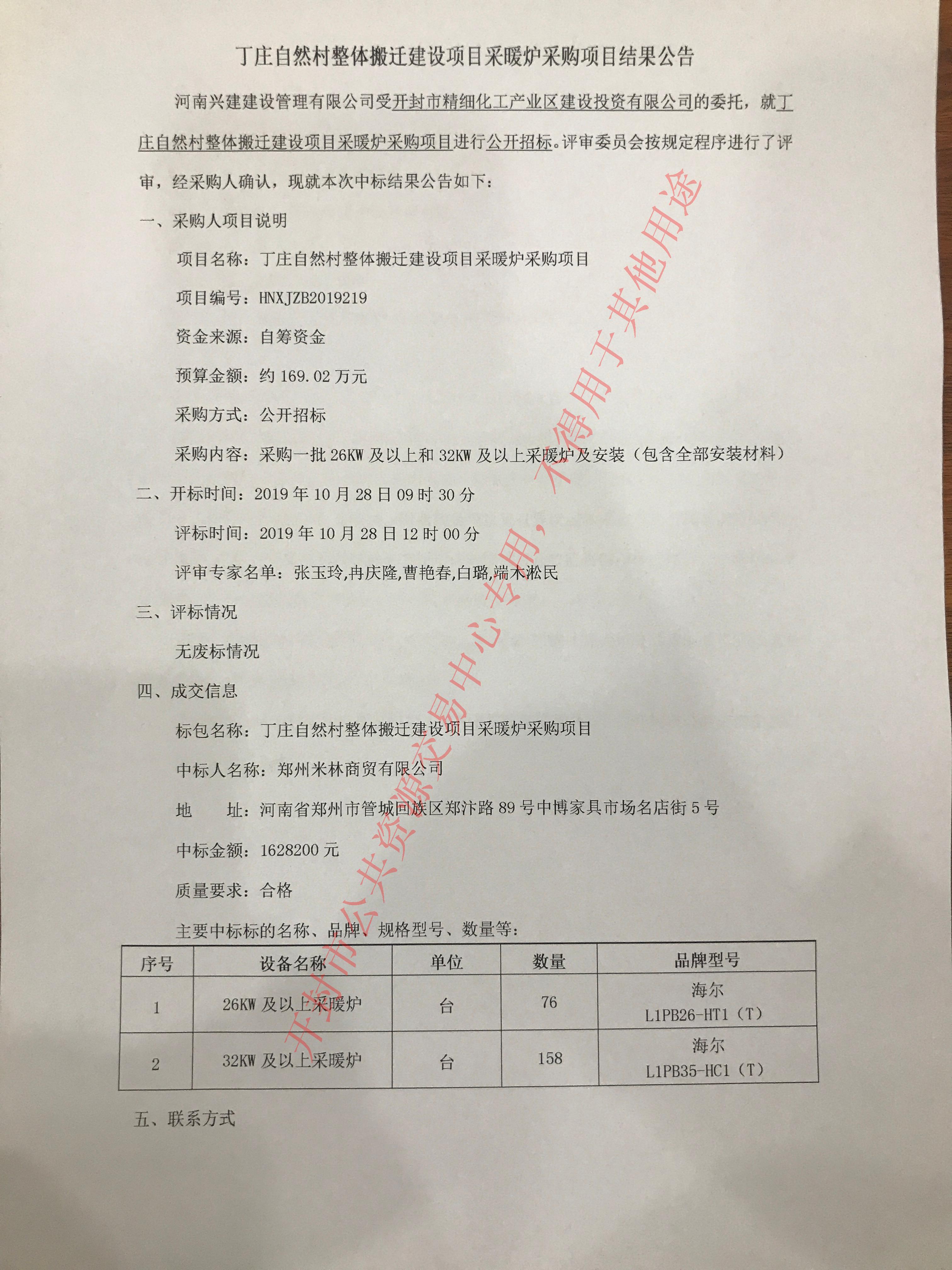 丁庄自然村整体搬迁建设项目采暖炉采购项目结果公告