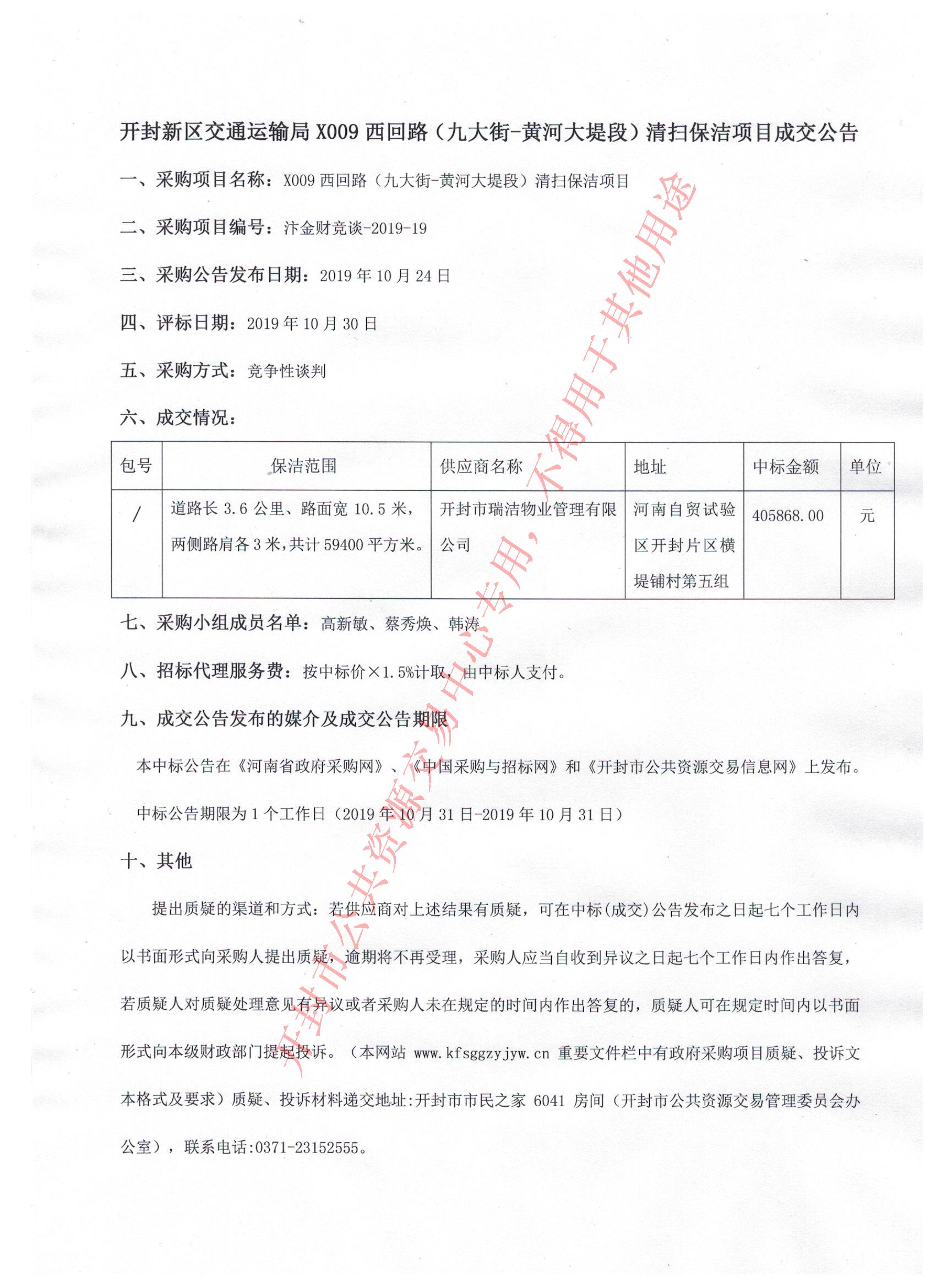 开封新区交通运输局X009西回路(九大街-黄河大堤段)清扫保洁项目成交公告