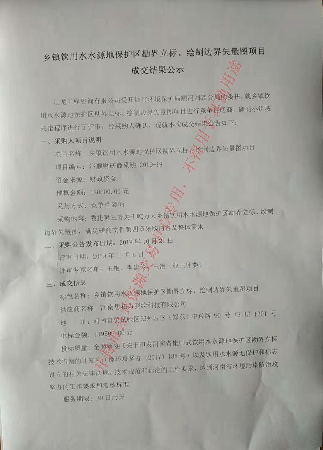 汇龙工程咨询有限公司受开封市环境保护局顺河回族分局的委托,就乡镇饮用水水源地保护区勘界立标、绘制边界矢量图项目进行竞争性磋商。磋商小组按规定程序进行了评审,经采购人确认,现就本次成交结果公告如下: