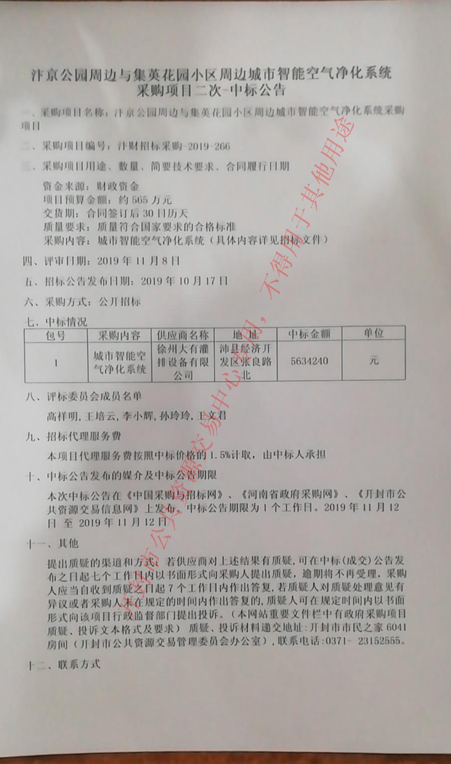 汴京公园周边与集英花园小区周边城市智能空气净化系统采购项目二次-中标公告