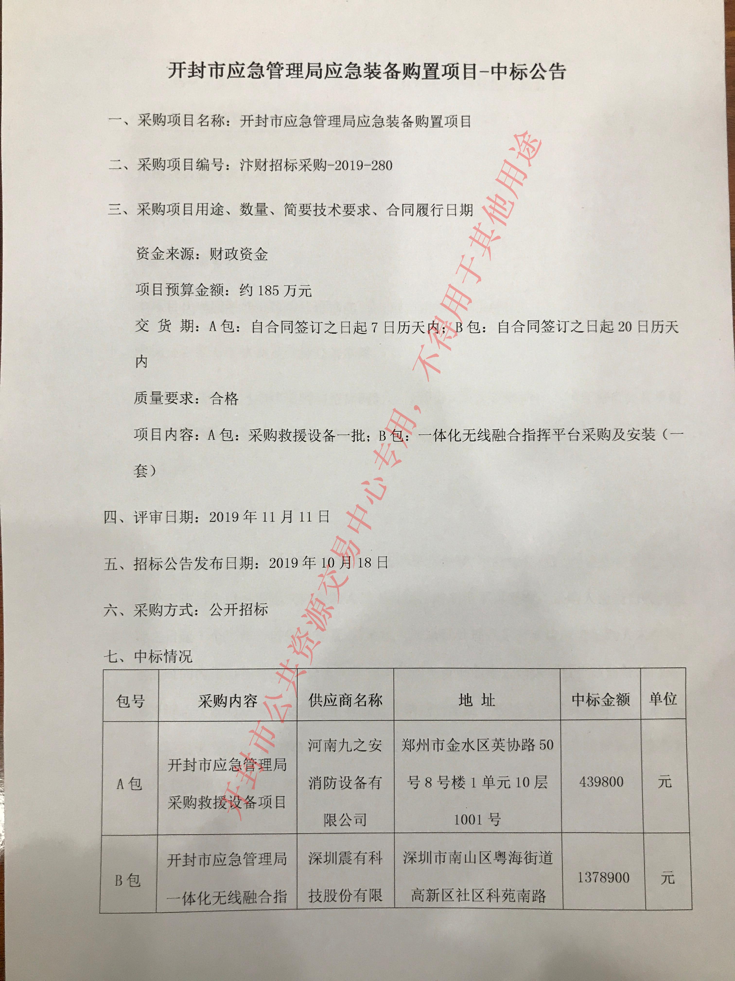 开封市应急管理局应急装备购置项目-中标公告