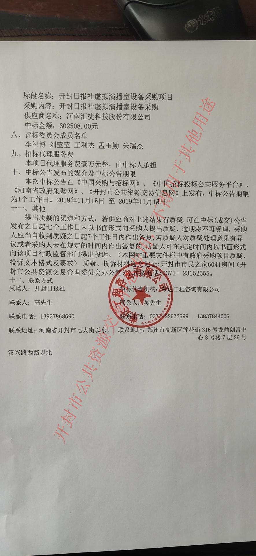 本次中标公告在《中国采购与招标网》、《中国招标投标公共服务平台》、《河南省政府采购网》、《开封市公共资源交易信息网》上发布。中标公告期限为1个工作日。2019年11月18日 至 2019年11月18日