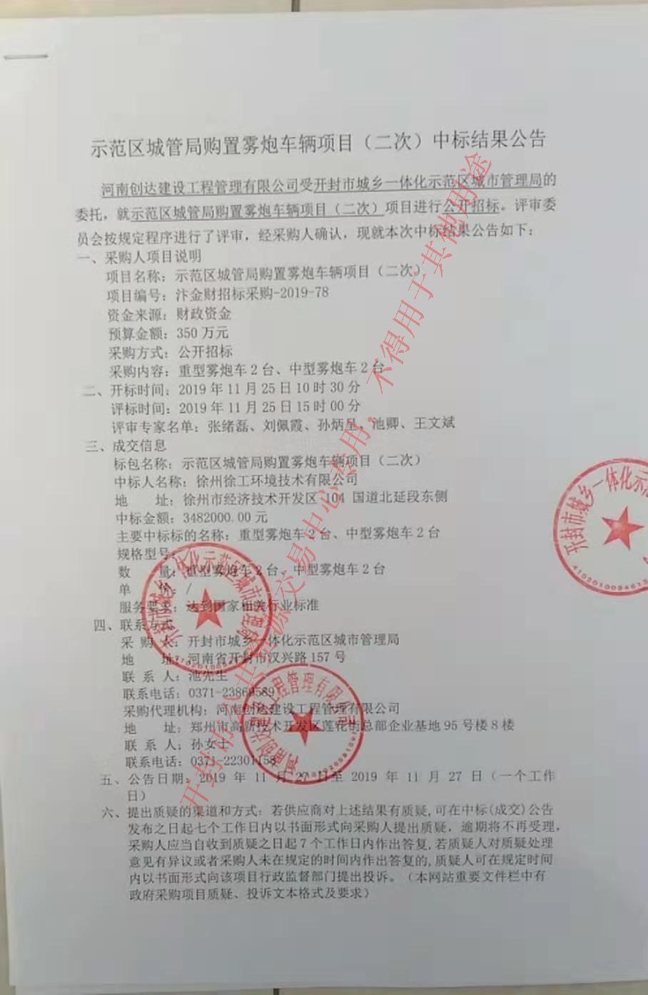 河南创达建设工程管理有限公司受开封市城乡一体化示范区城市管理局的委托,就示范区城管局购置雾炮车辆项目(二次)项目进行公开招标。评审委员会按规定程序进行了评审,经采购人确认,现就本次中标结果公告如下: