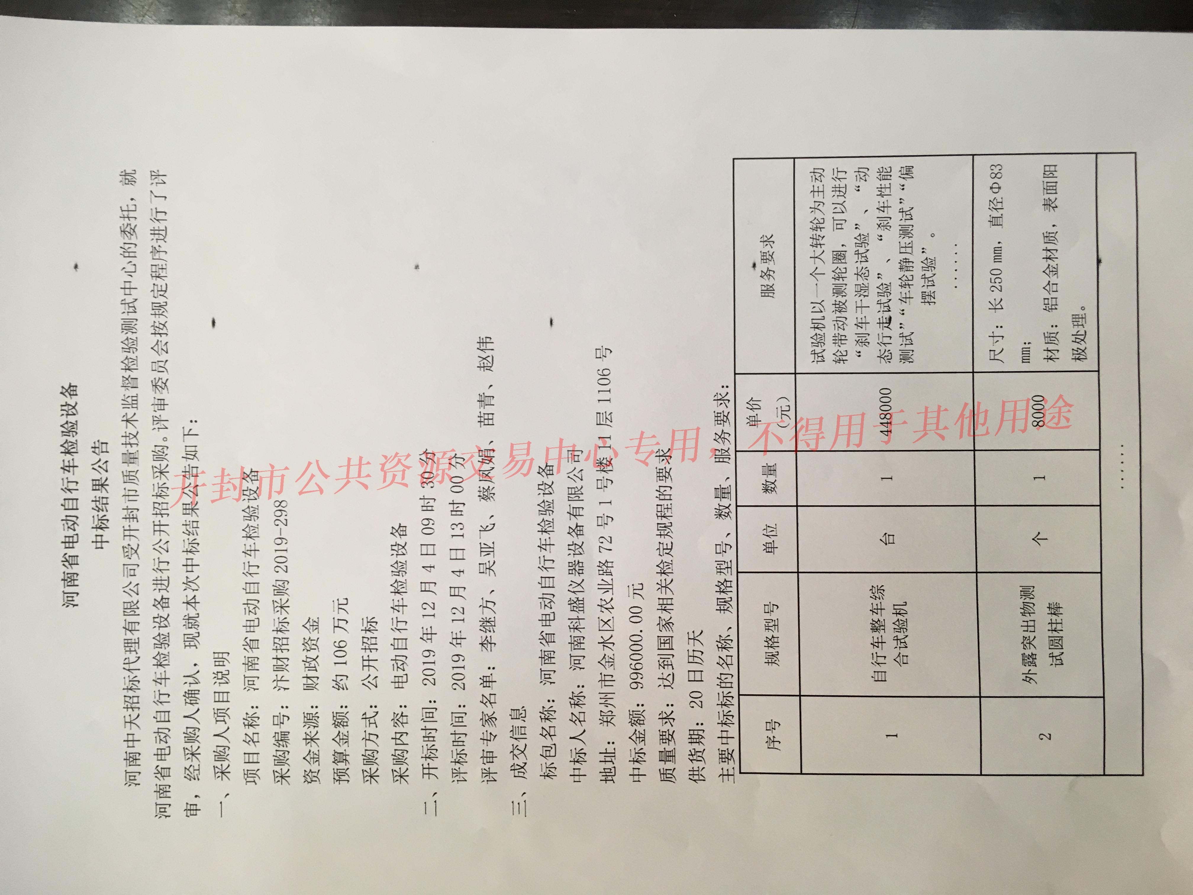 河南中天招标代理有限公司受开封市质量技术监督检验测试中心的委托,就河南省电动自行车检验设备进行公开招标采购。评审委员会按规定程序进行了评审,经采购人确认,现就本次中标结果公告如下: