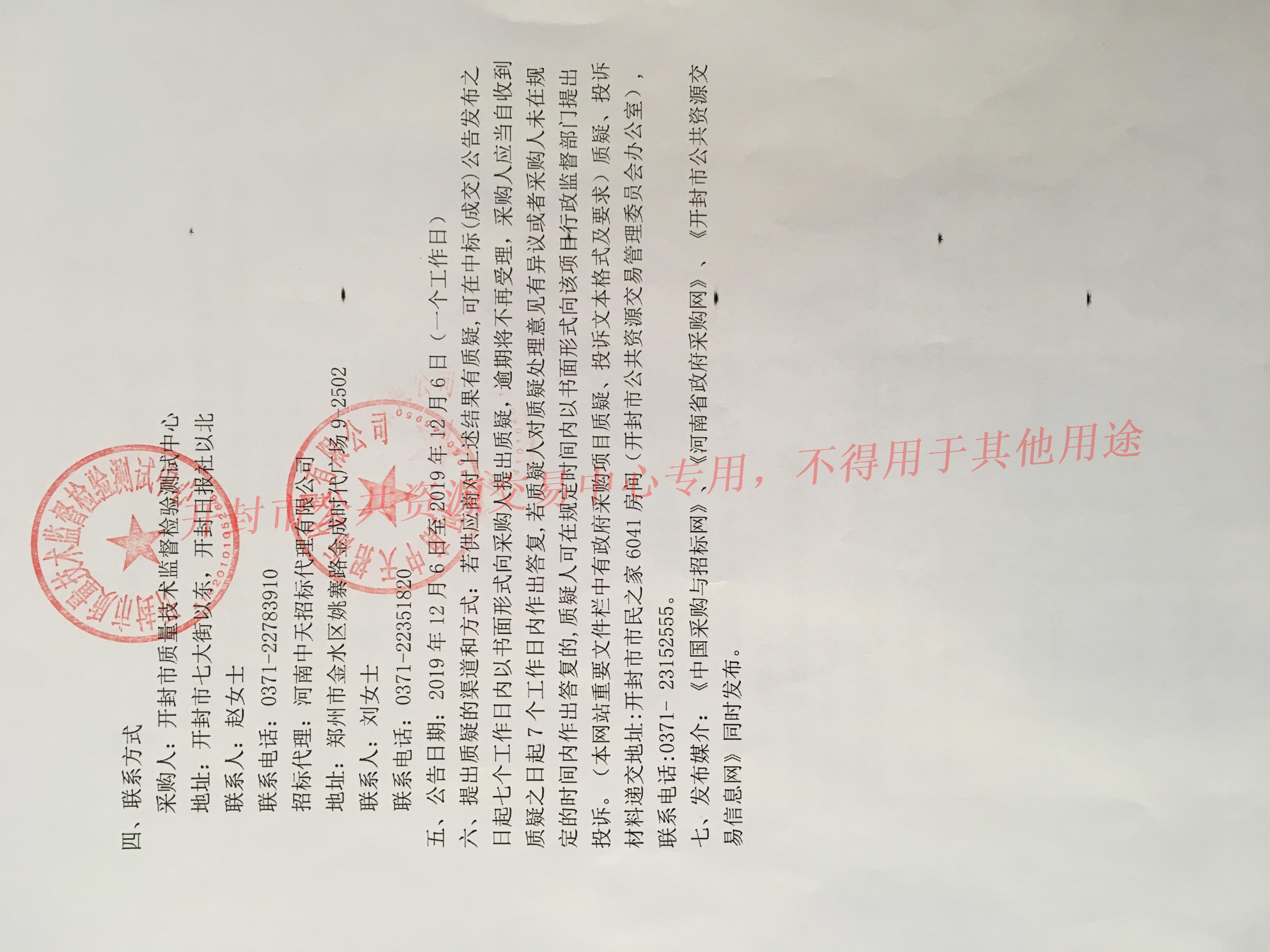 六、提出质疑的渠道和方式:若供应商对上述结果有质疑,可在中标(成交)公告发布之日起七个工作日内以书面形式向采购人提出质疑,逾期将不再受理,采购人应当自收到质疑之日起7个工作日内作出答复,若质疑人对质疑处理意见有异议或者采购人未在规定的时间内作出答复的,质疑人可在规定时间内以书面形式向该项目行政监督部门提出投诉。(本网站重要文件栏中有政府采购项目质疑、投诉文本格式及要求)质疑、投诉材料递交地址:开封市市民之家6041房间(开封市公共资源交易管理委员会办公室),联系电话:0371- 23152555。
