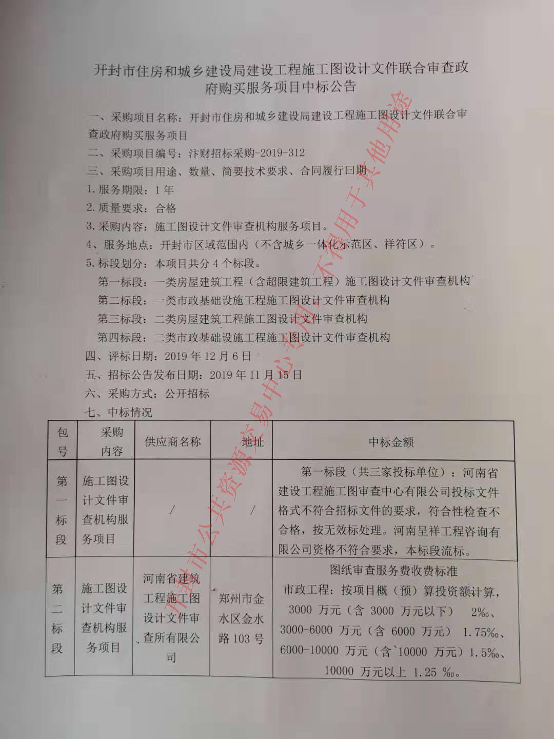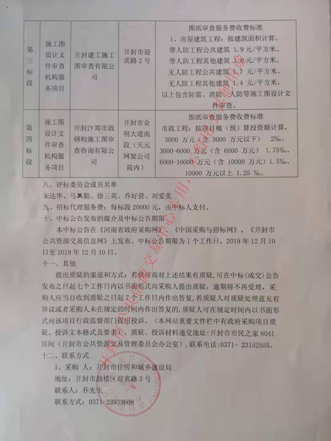 开封市住房和城乡建设局建设工程施工图设计文件联合审查政府购买服务项目中标公告