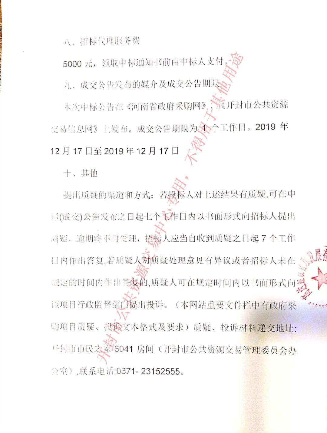 本次中标公告在《河南省政府采购网》、《开封市公共资源交易信息网》上发布。成交公告期限为1个工作日。2019年12月17日至2019年12月17日