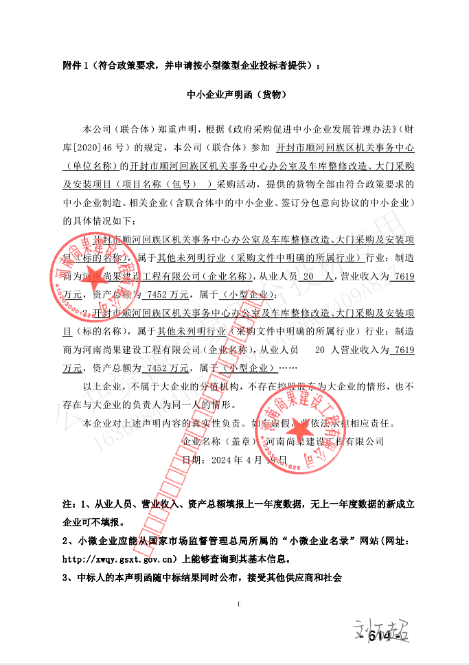 开封市顺河回族区机关事务中心办公室及车库整修改造、大门采购及安装项目-成交公告