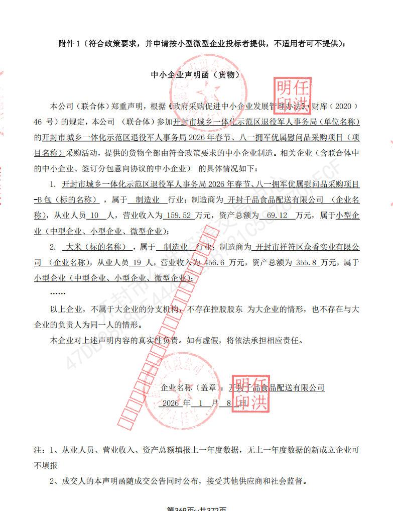 开封市城乡一体化示范区退役军人事务局2026年春节、八一拥军优属慰问品采购项目-B包中标公告