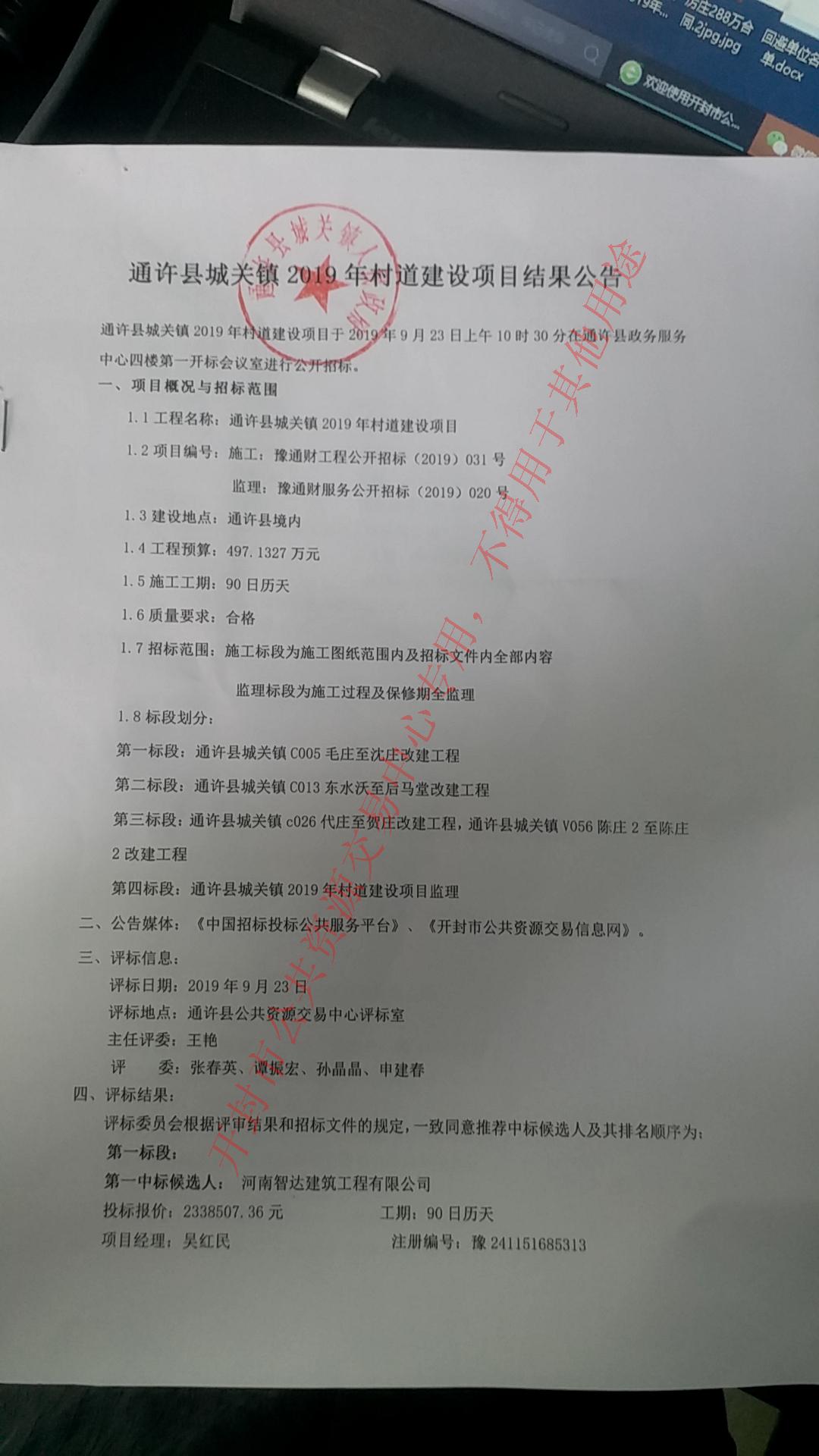 通许县城关镇2019年村道建设项目于2019年9月23日上午10时30分在通许县政务服务中心四楼第一开标会议室进行公开招标。