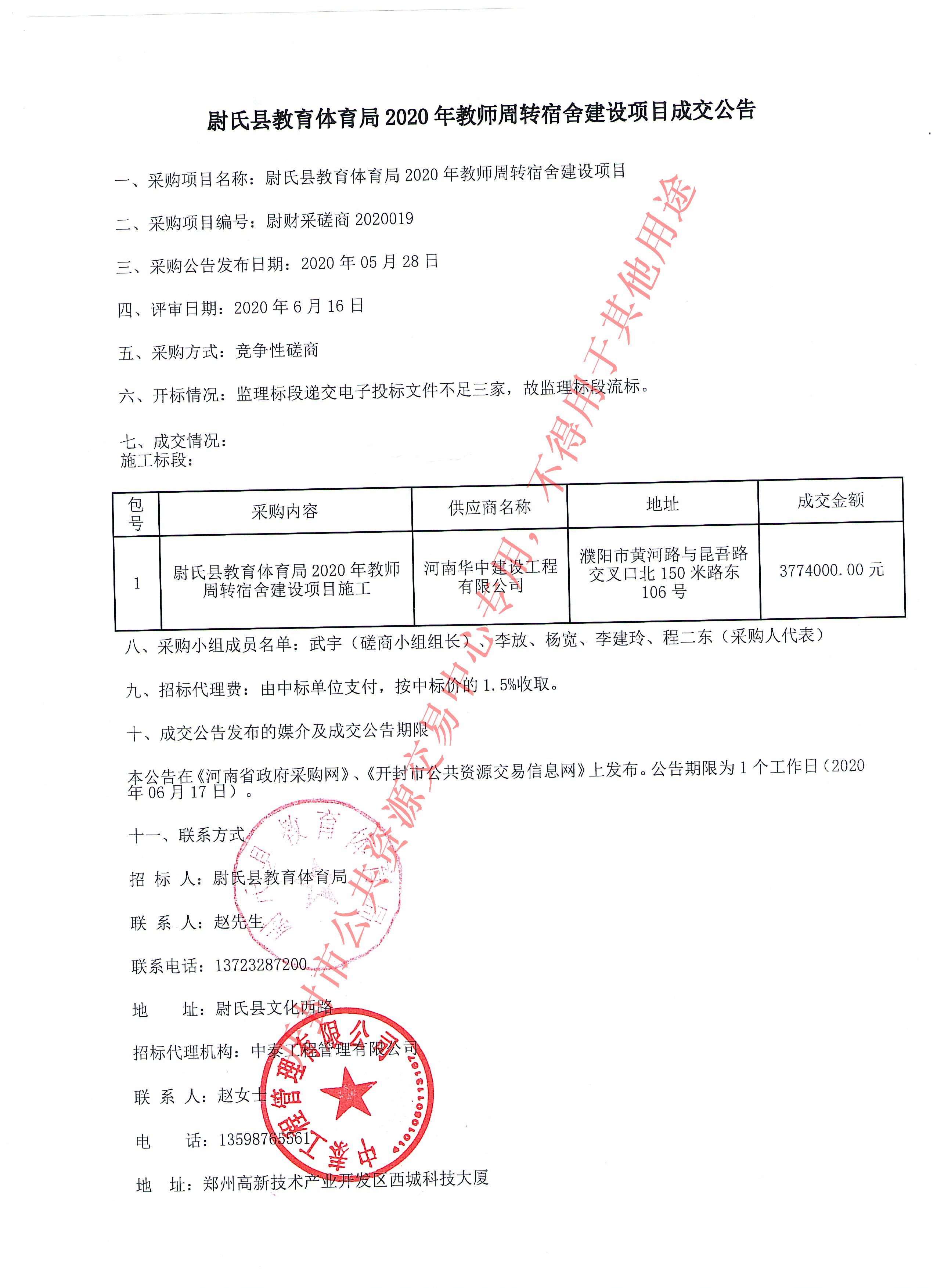 尉氏县教育体育局2020年教师周转宿舍建设项目成交公告