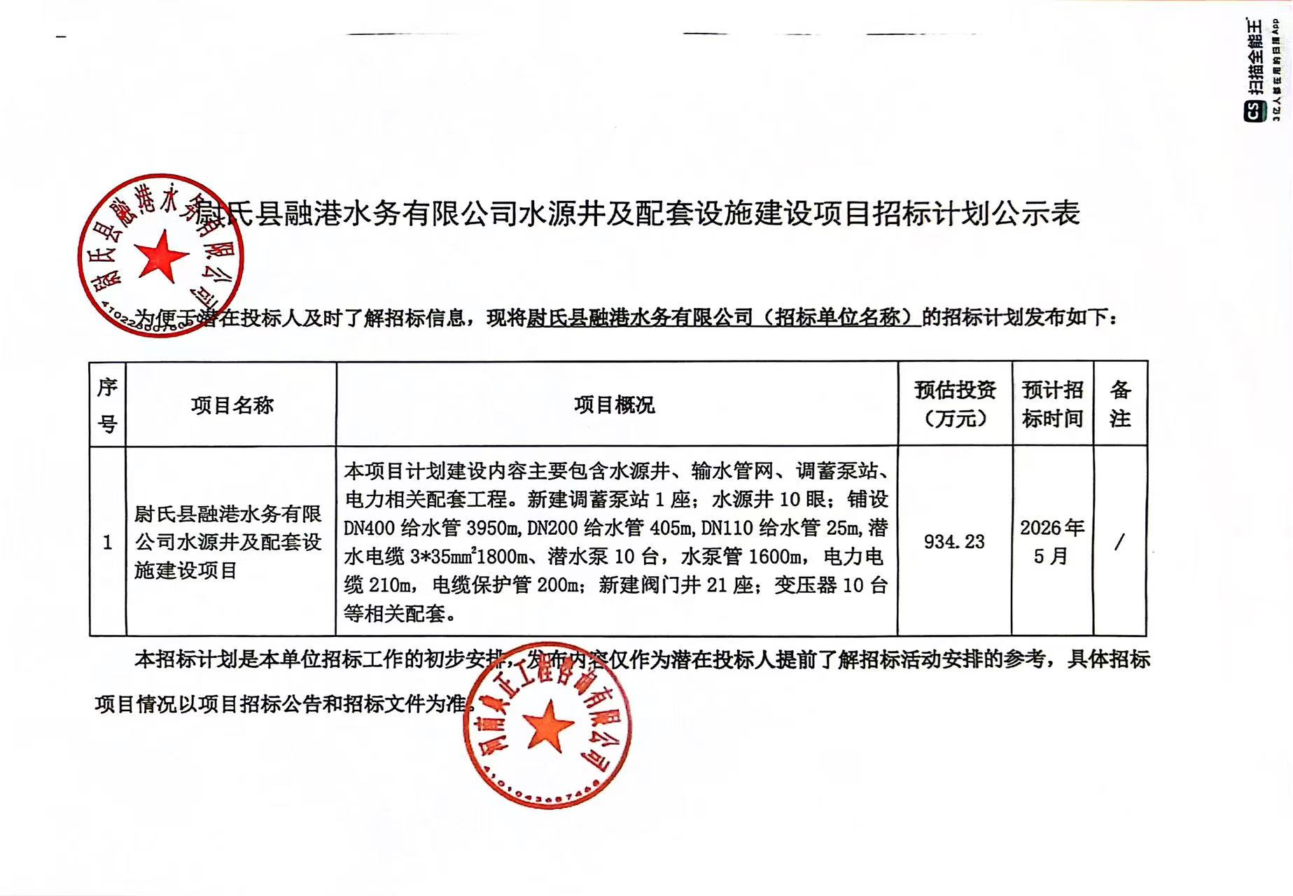 尉氏县融港水务有限公司水源井及配套设施建设项目招标计划公示表