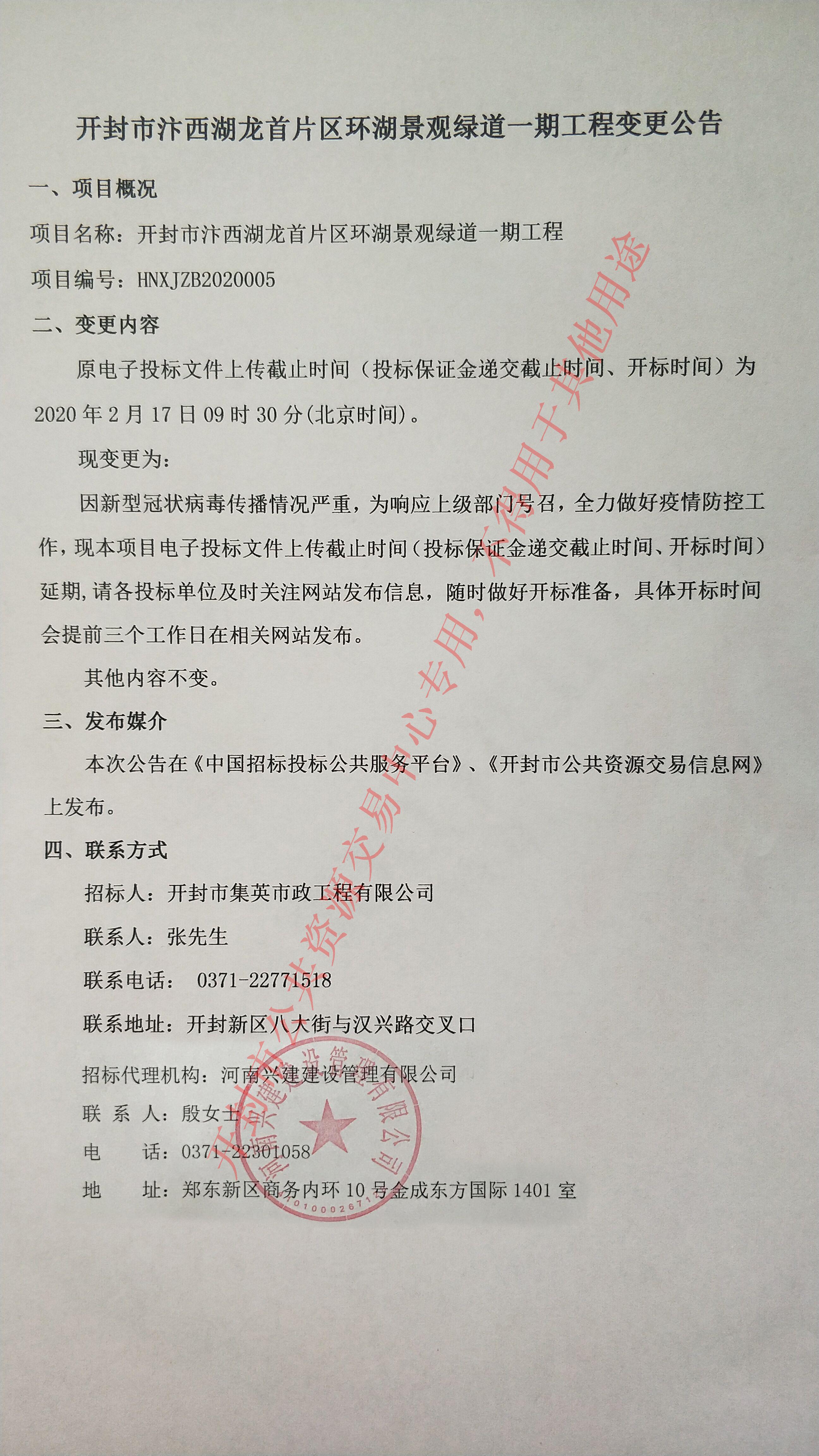 开封市汴西湖龙首片区环湖景观绿道一期工程变更公告