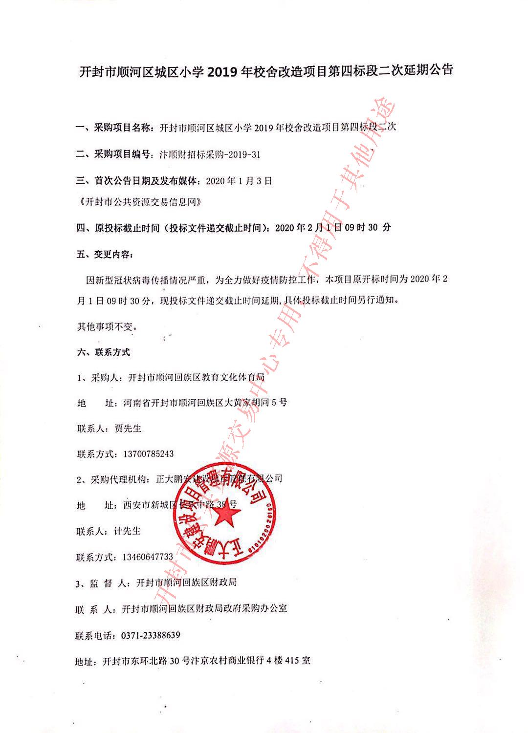 开封市顺河区城区小学2019年校舍改造项目第四标段二次延期公告
