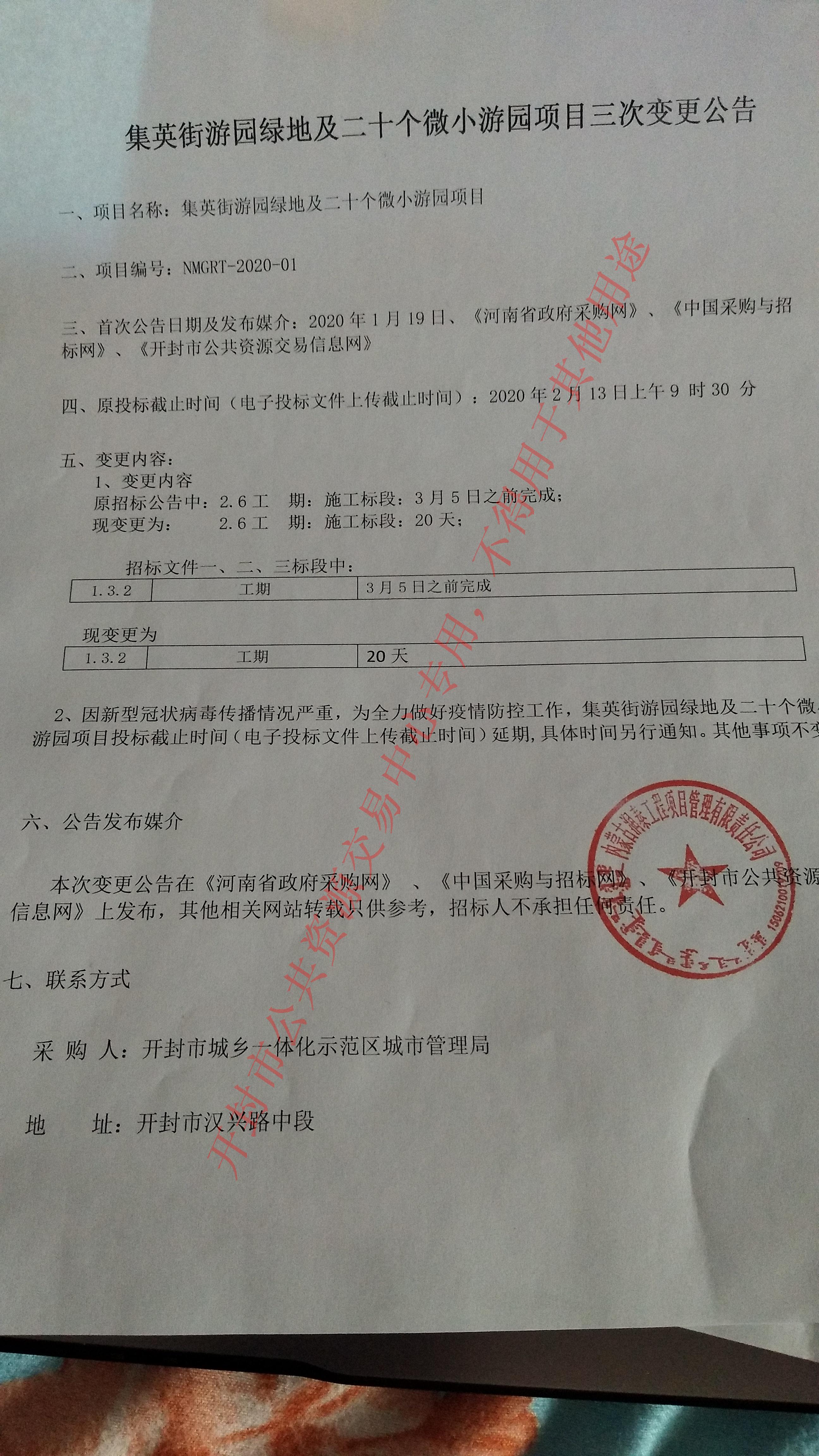 2、因新型冠状病毒传播情况严重,为全力做好疫情防控工作,集英街游园绿地及二十个微小游园项目投标截止时间(电子投标文件上传截止时间)延期,具体时间另行通知。其他事项不变。