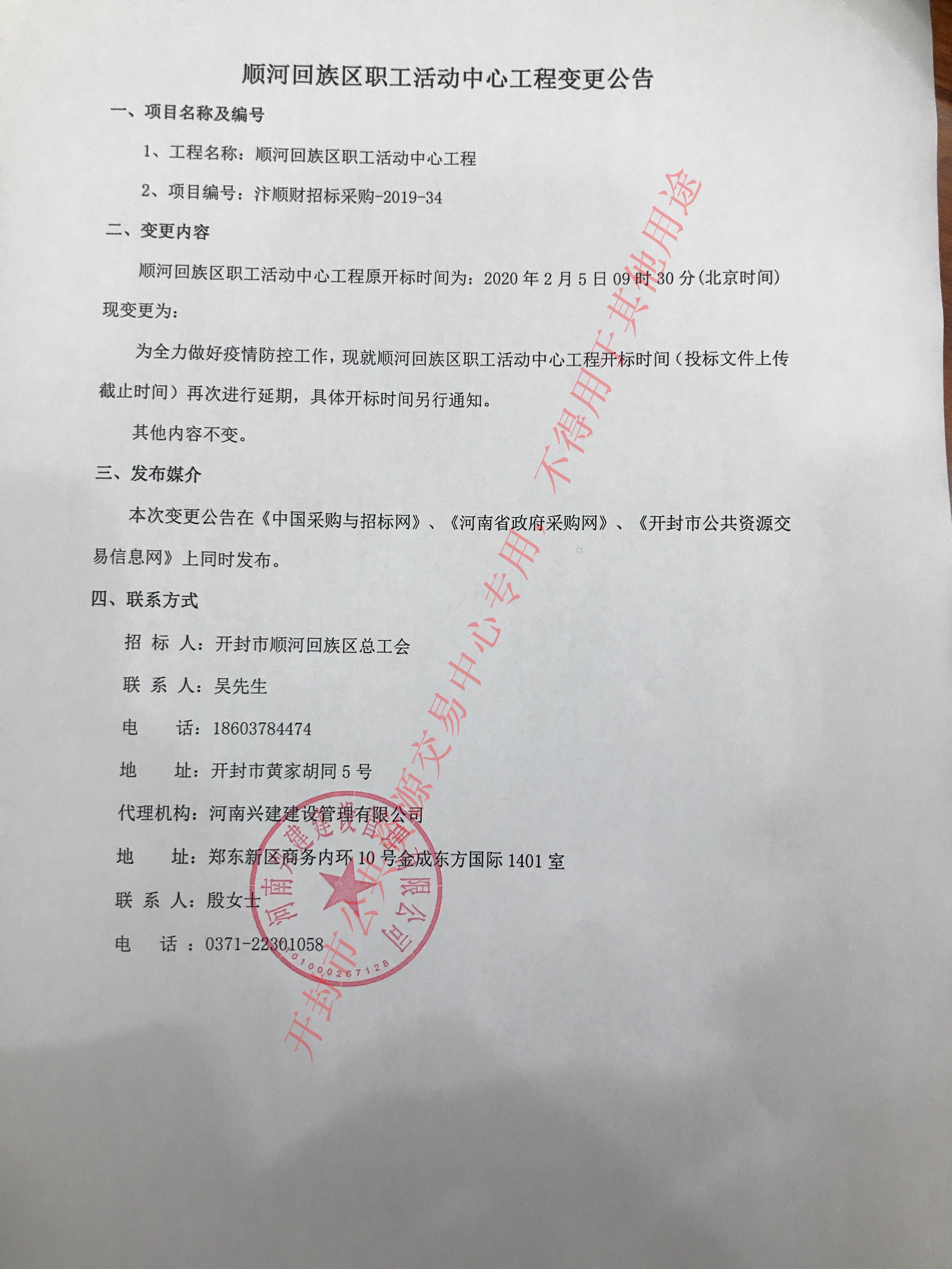 顺河回族区职工活动中心工程原开标时间为:2020年2月5日09时30分(北京时间)