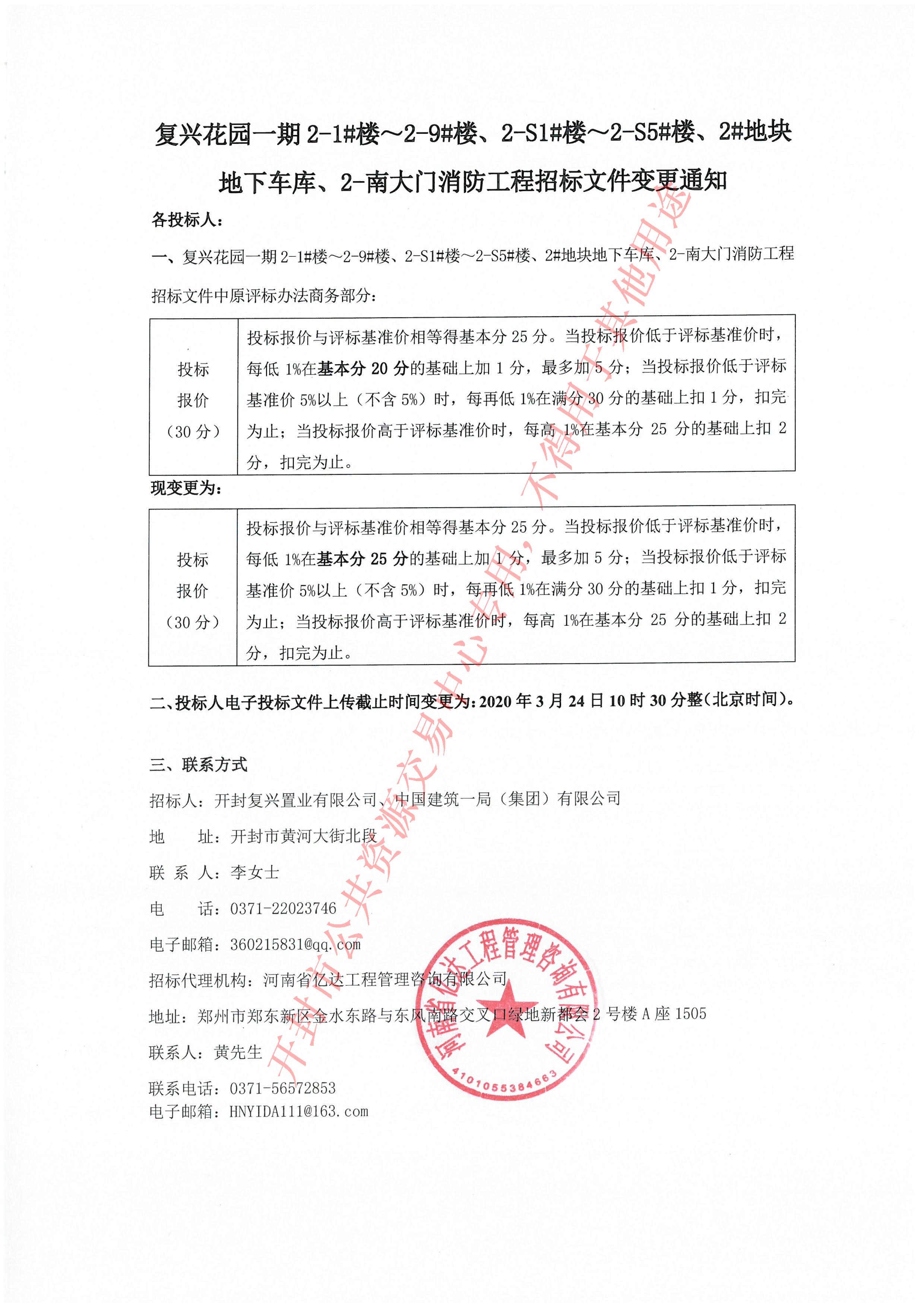复兴花园一期2-1#楼~2-9#楼、2-S1#楼~2-S5#楼、2#地块地下车库、2-南大门消防工程招标文件变更通知