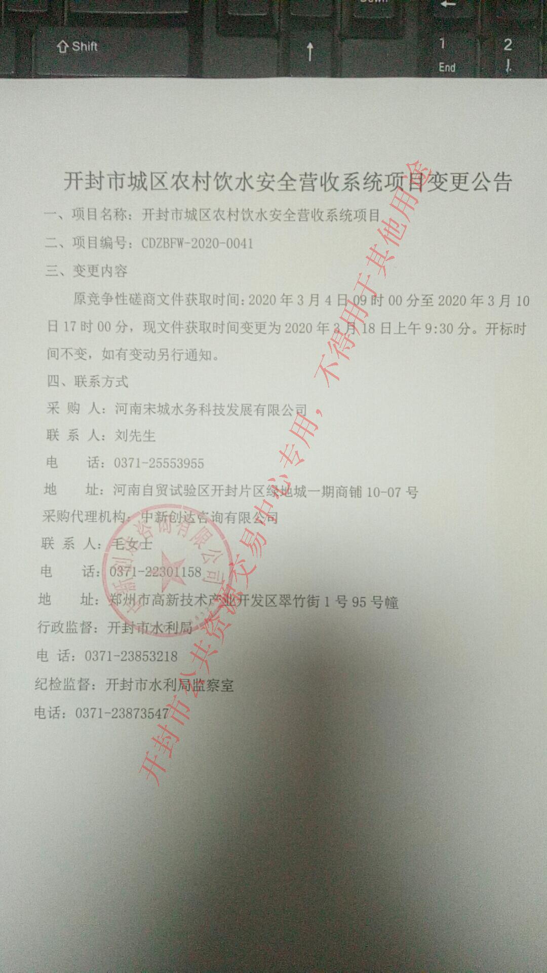 一、项目名称:开封市城区农村饮水安全营收系统项目