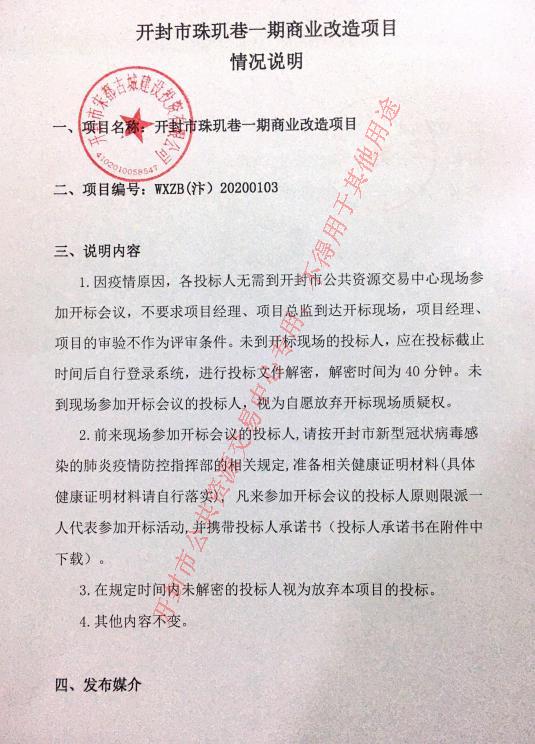 1.因疫情原因,各投标人无需到开封市公共资源交易中心现场参加开标会议,不要求项目经理、项目总监到达开标现场,项目经理、项目总监的审验不作为评审条件。未到开标现场的投标人,应在投标截止时间后自行登录系统,进行投标文件解密,解密时间为40分钟。未到现场参加开标会议的投标人,视为自愿放弃开标现场质疑权。