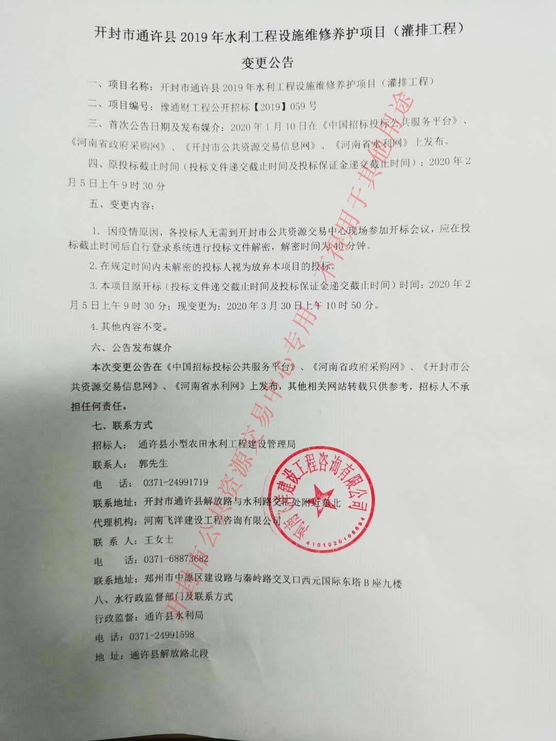 开封市通许县2019年水利工程设施维修养护项目(灌排工程)变更公告
