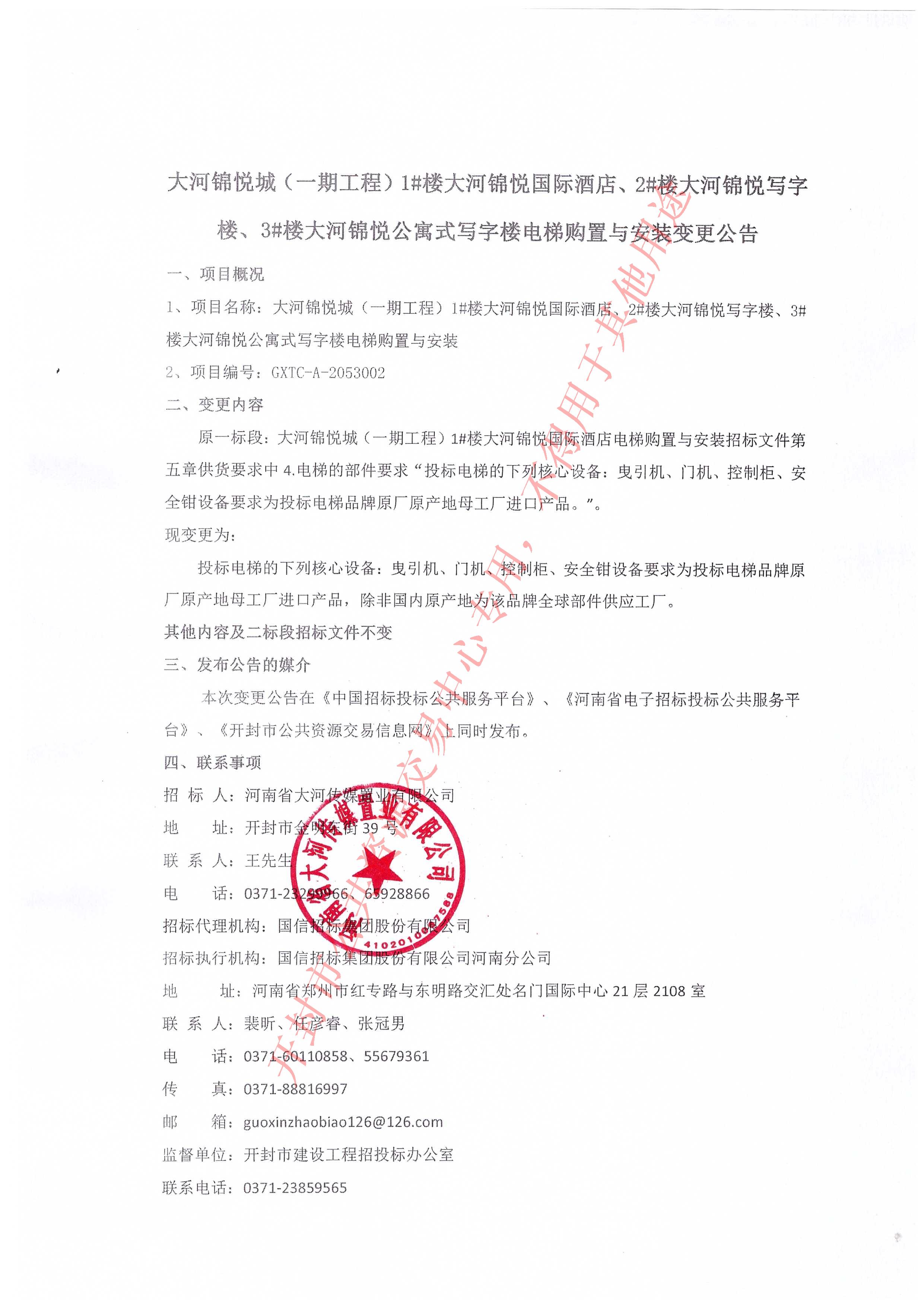大河锦悦城(一期工程)1#楼大河锦悦国际酒店、2#楼大河锦悦写字楼、3#楼大河锦悦公寓式写字楼电梯购置与安装变更公告