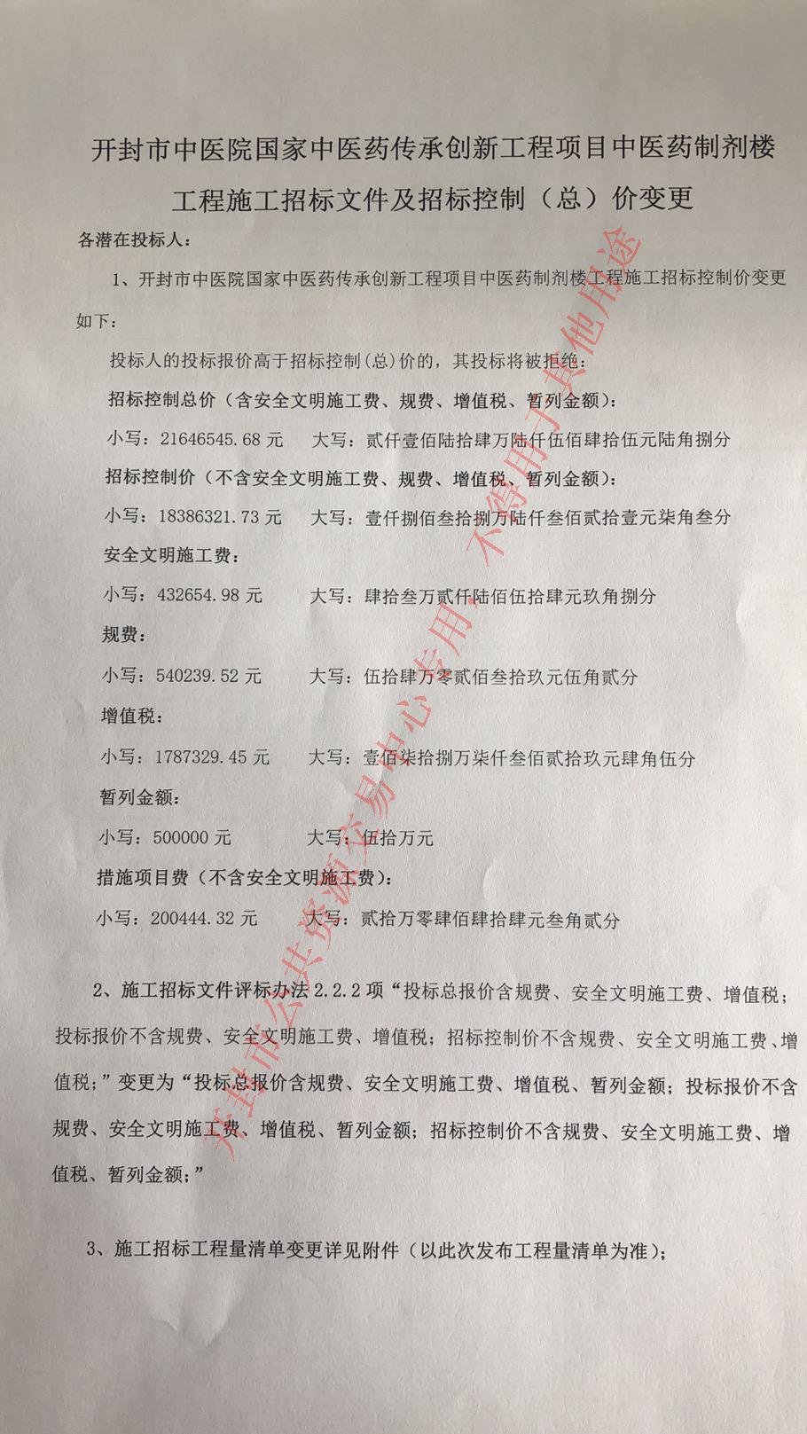 1、开封市中医院国家中医药传承创新工程项目中医药制剂楼工程施工招标控制价变更如下: